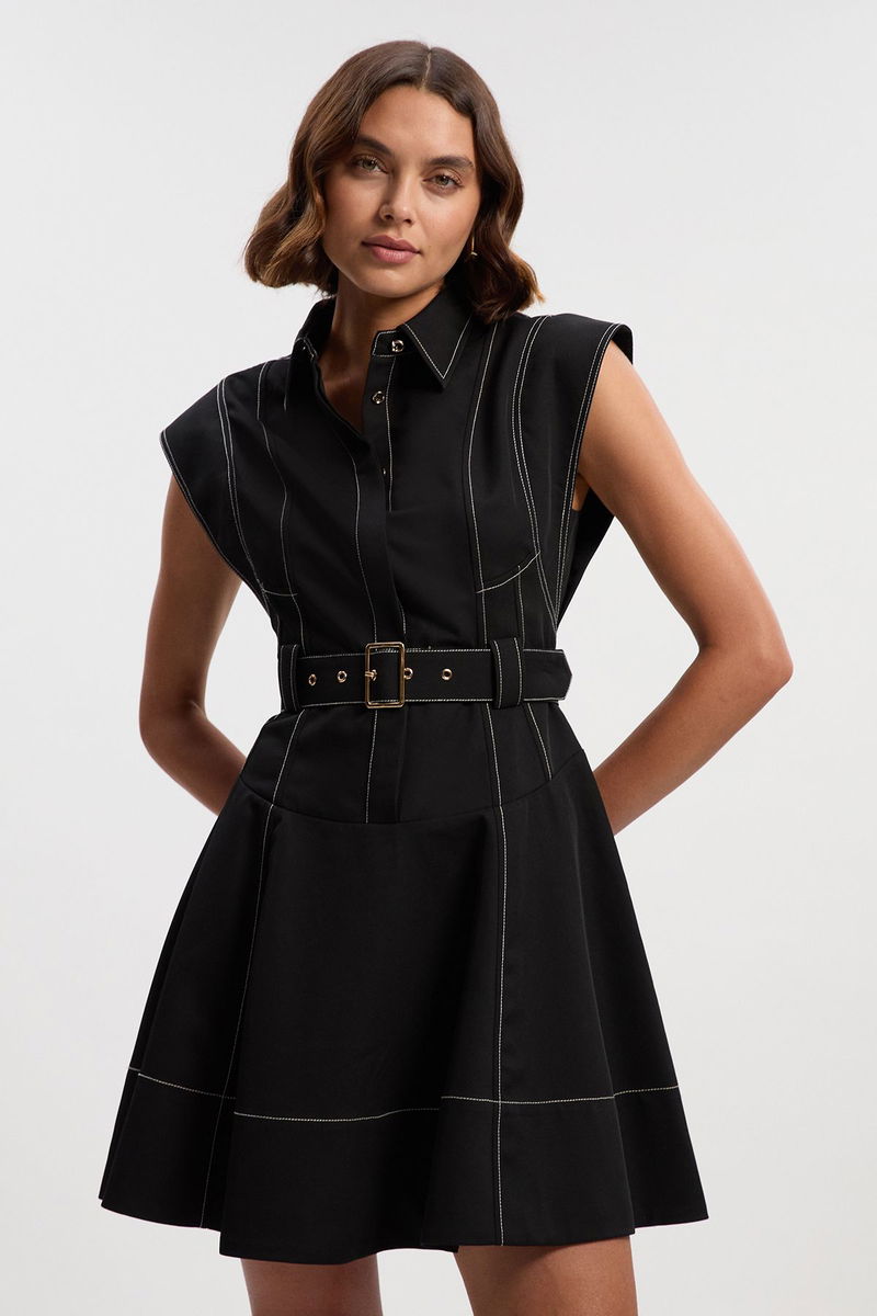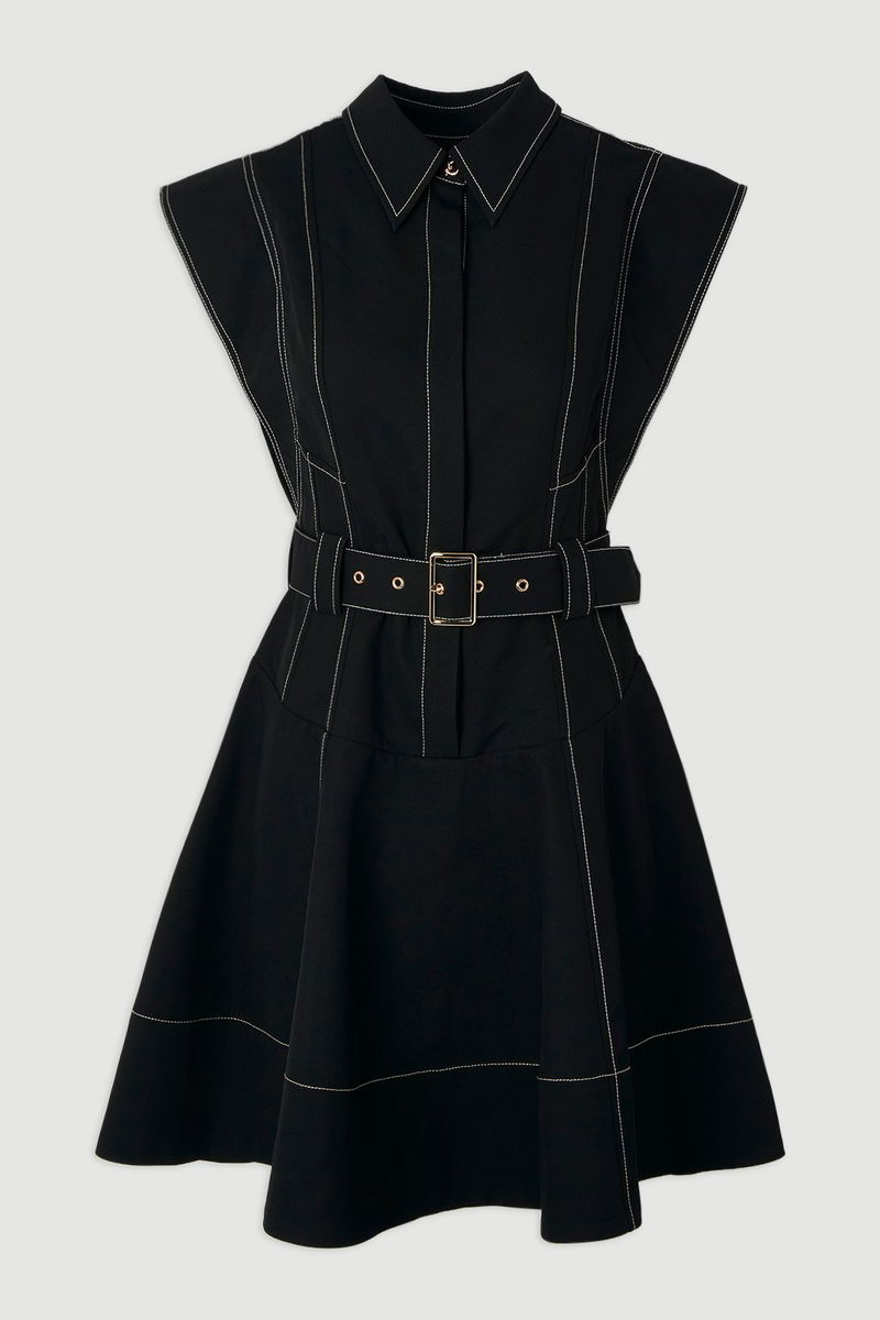 This Karen Millen midi dress showcases sophisticated craftsmanship with its architectural silhouette and meticulous contrast stitching. The high neck collar and cap shoulders create a contemporary structured look, whilst the belted waist defines your figure. The A-line skirt offers comfortable movement, making it ideal for casual office days. This versatile piece transitions effortlessly from day to evening. Simply swap your flats for block heels and add statement earrings for evening plans. A timeless addition to your wardrobe that reflects Karen Millen's commitment to polished, contemporary design.