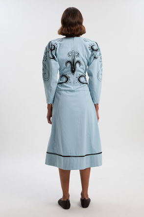 Elegant midaxi length shirt dress with a sophisticated silhouette Versatile woven fabric for year-round wear Striking contrast piping details for a contemporary edge Flattering belted waist to accentuate your figure Classic collared neckline and full-length button placket.