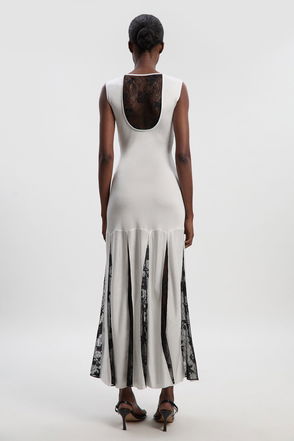 Viscose blend knit cut out stripe midi dress.