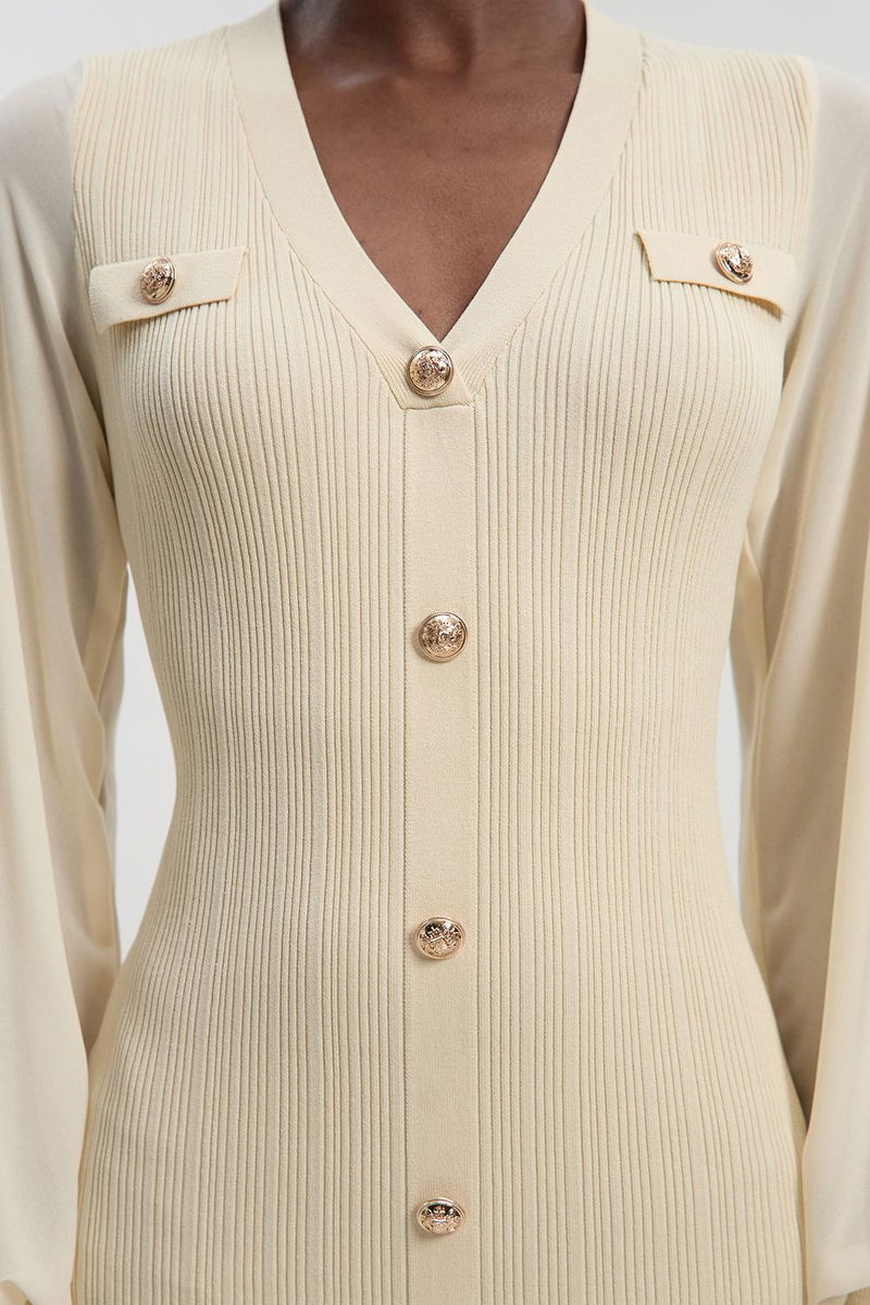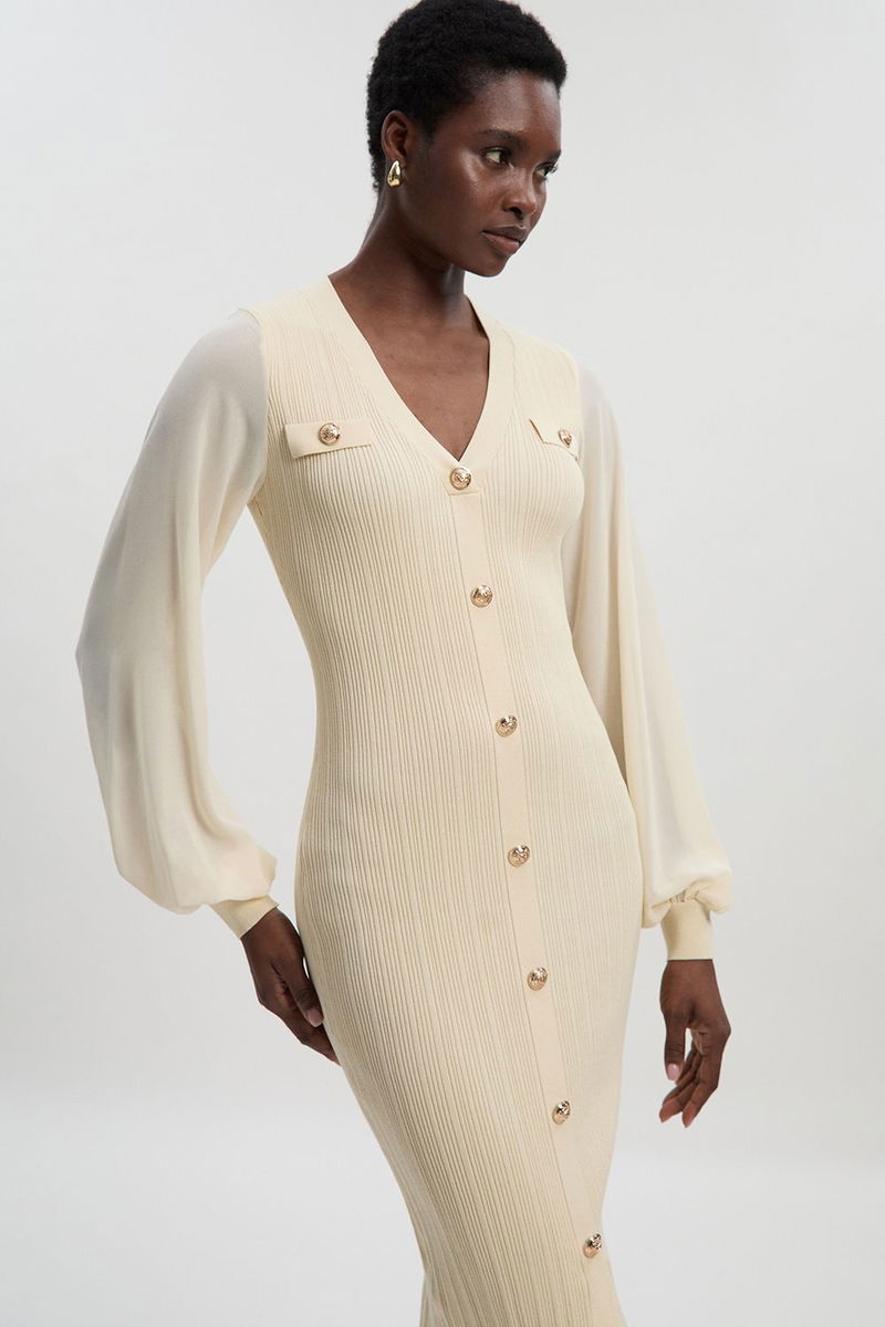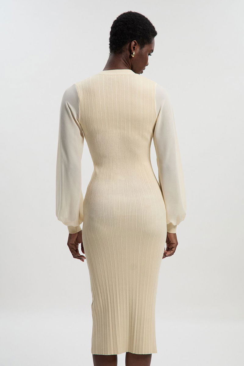 Viscose Blend Rib Knit Chiffon Sleeve Midi Dress