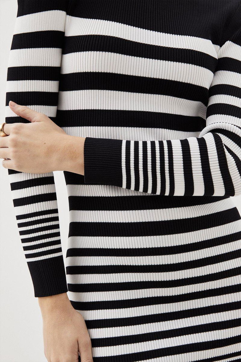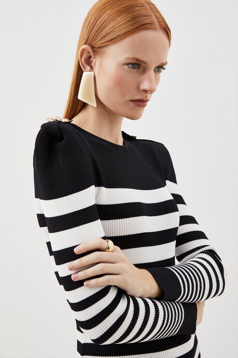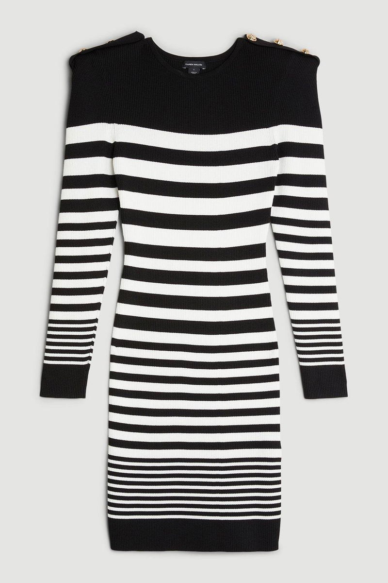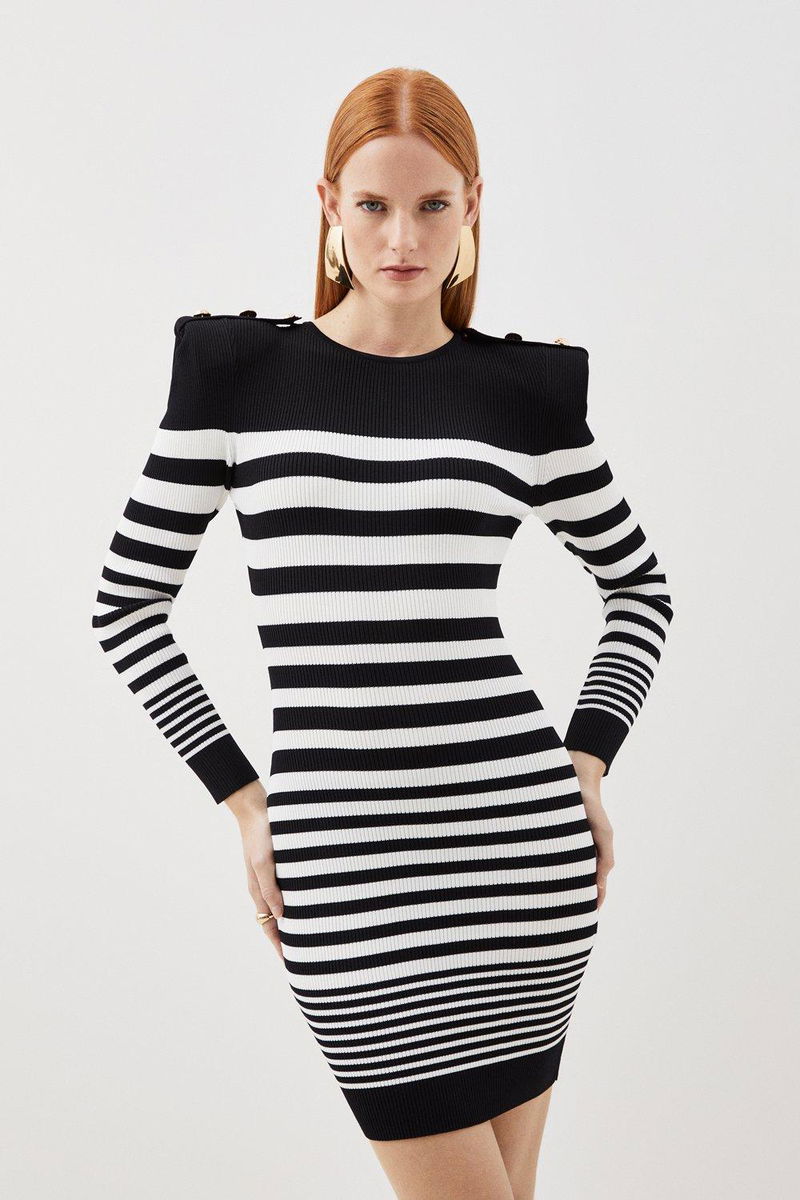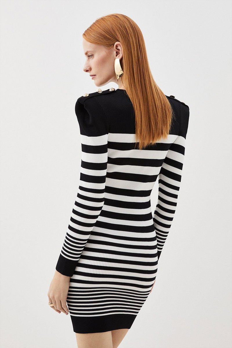 Structured proportions define this military-inspired mini dress, contouring the silhouette with a ribbed-knit construction that is punctuated with embossed gold-tone buttons to the bold padded shoulders. The striped design adds a timeless touch, style this piece with boots or heels to complete the look.