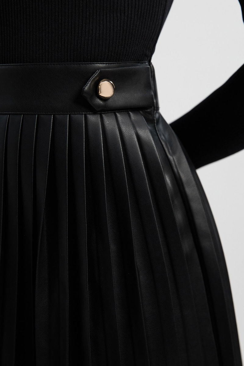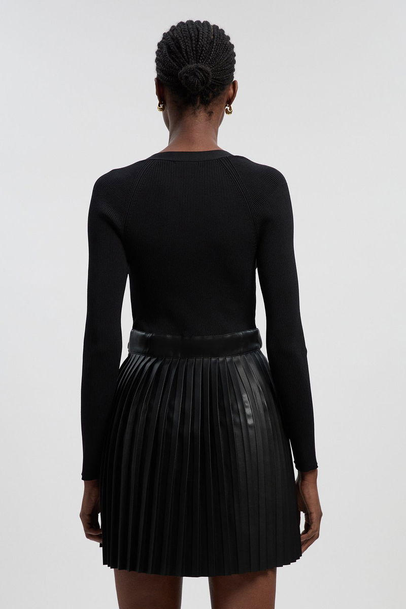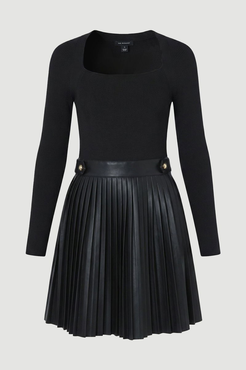 Viscose Rib Pu Mix Tab Detail Pleated Knit Mini Dress