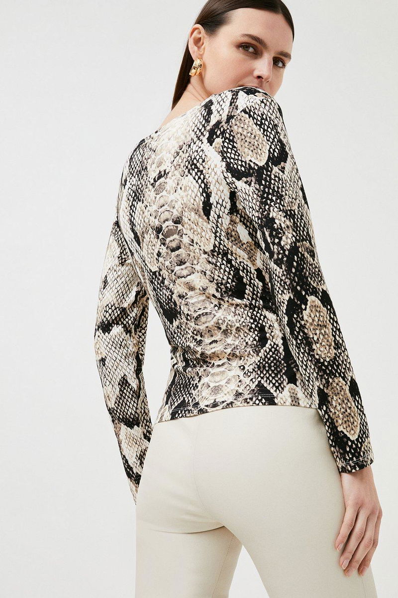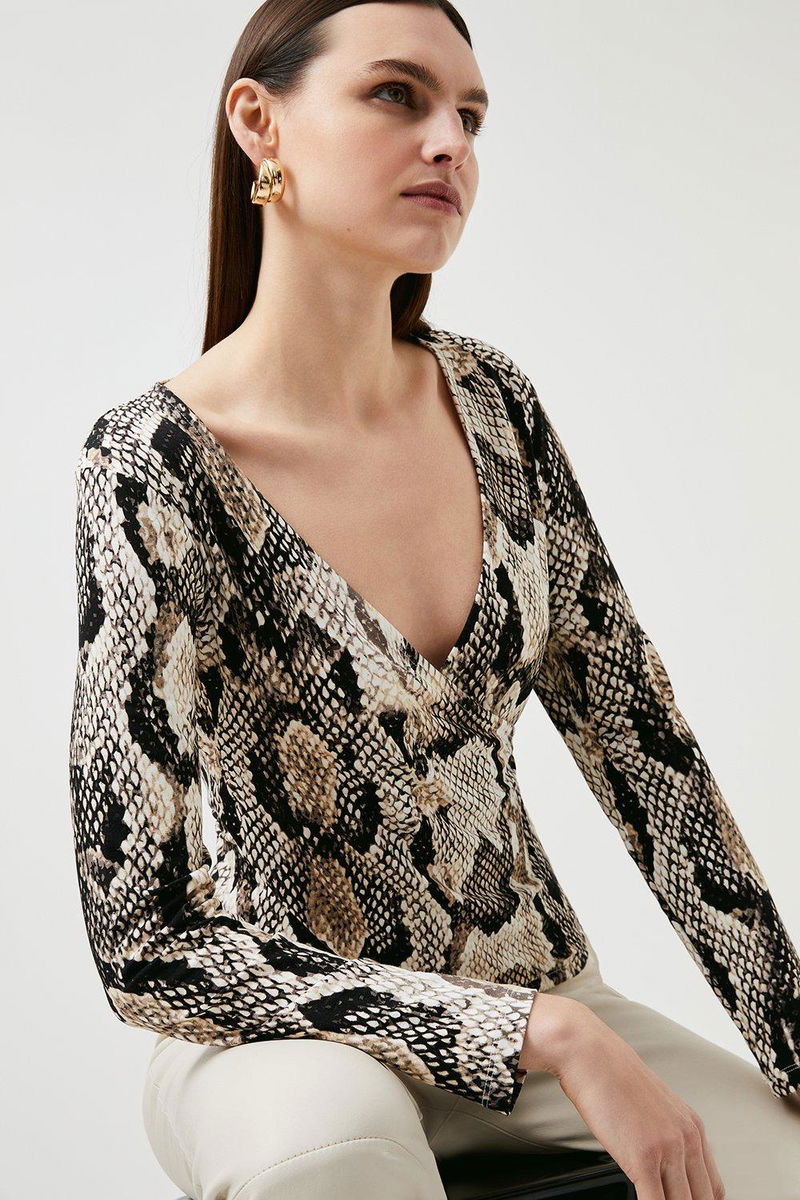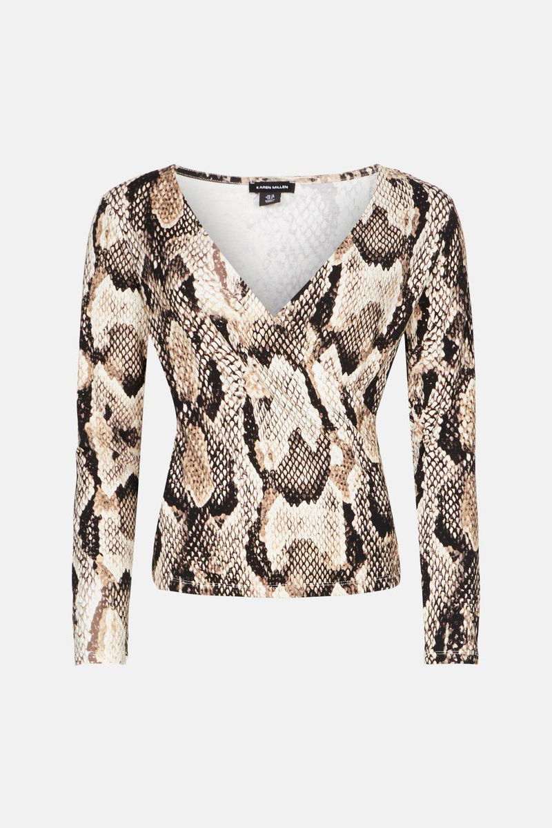 Trade in tired tops for this daring design. Emboldened with snake print and a feminine wrap front, this sleek style adds exotic elegance to tonal separates and denim alike.