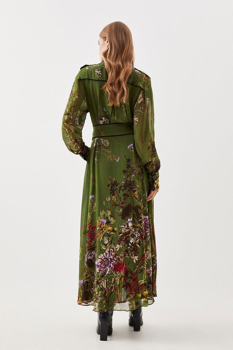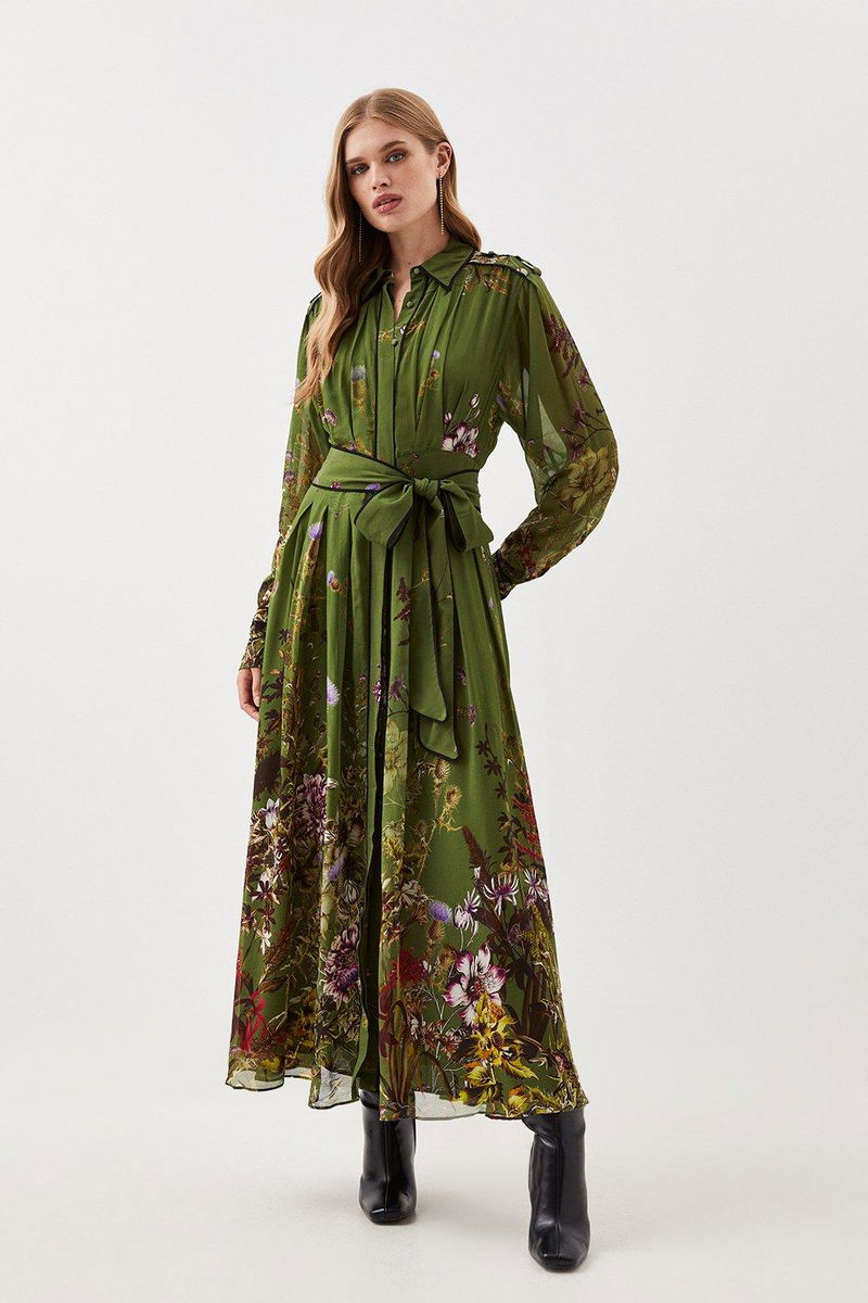 This classic shirt dress is enlivened with an intricate floral print. A wrap belt complements the lightweight, airy fabric and balloon sleeves to create a flattering silhouette. Style this midi dress with boots and a trench coat for an everyday outfit or elevate with heels and accessories for your next event.