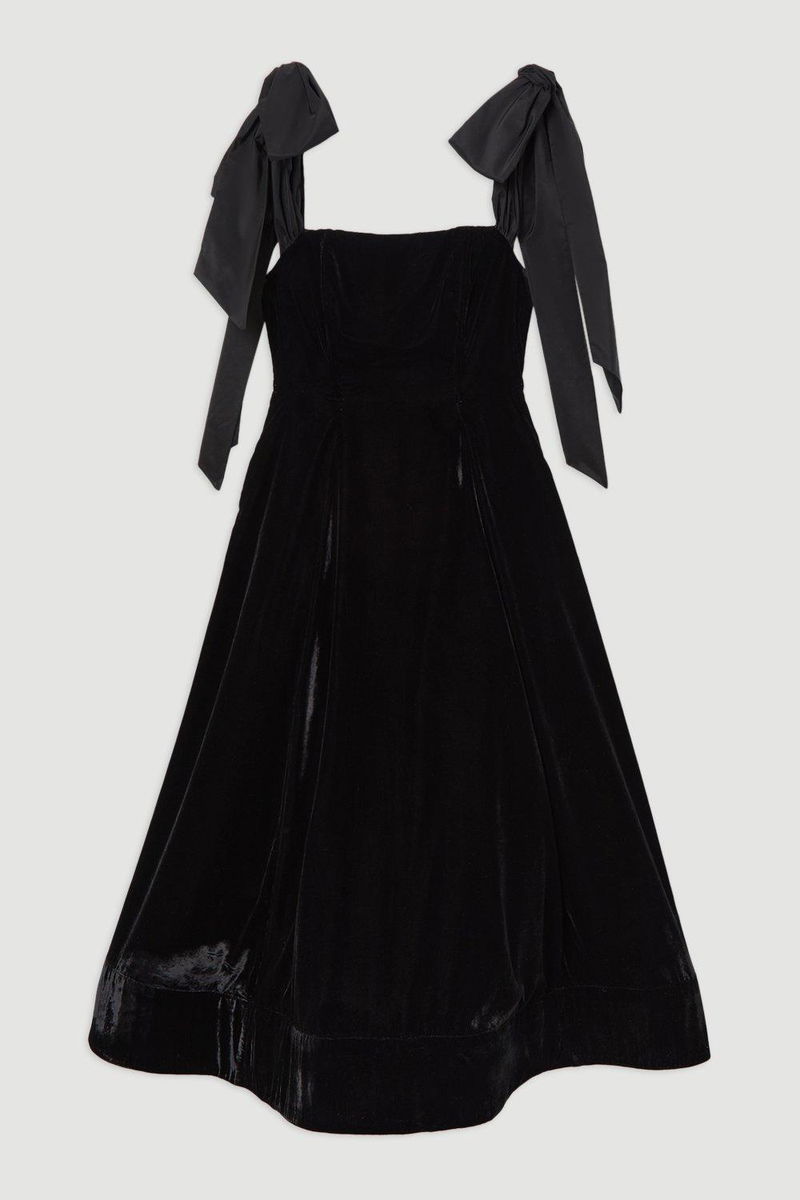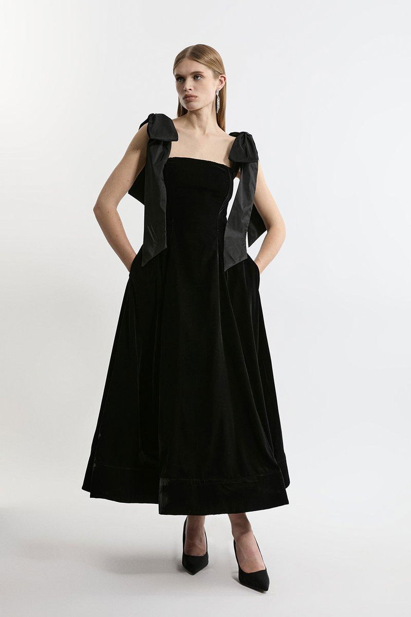 A new season collection with Lydia Millen, infused with sophistication and flair for the party season. With a romantic twist, this petite dress is crafted from a decadent velvet fabric that immediately catches the eye, making it perfect for all those special occasions. This enchanting full skirt is cut to a high waist and features a maxi length that sits at the ankles and skims the hips for a flattering fit. The bow straps are made from a contrasting taffeta fabric, bringing an even more feminine charm to the look. Indulge in elevated formality and style with strappy heels for an evening look with a difference.