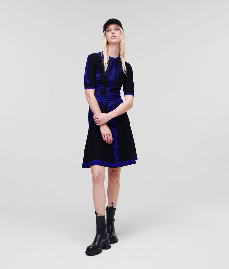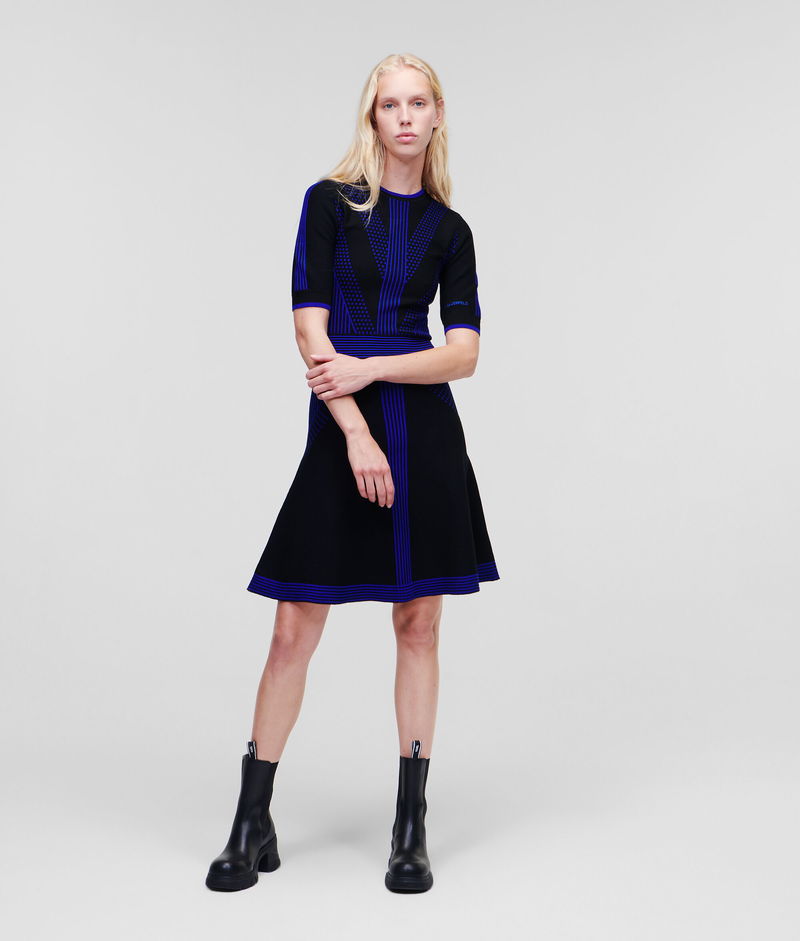 Featuring a standout geometric design, this viscose-blend knitted dress offers an enhanced feminine silhouette. Three-quarter length sleeves and a fit-and-flare skirt further elevate the ultra-flattering shaping of this seasonal must-have.