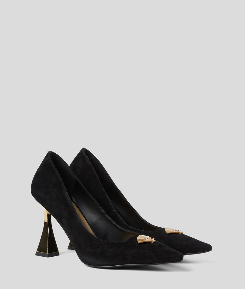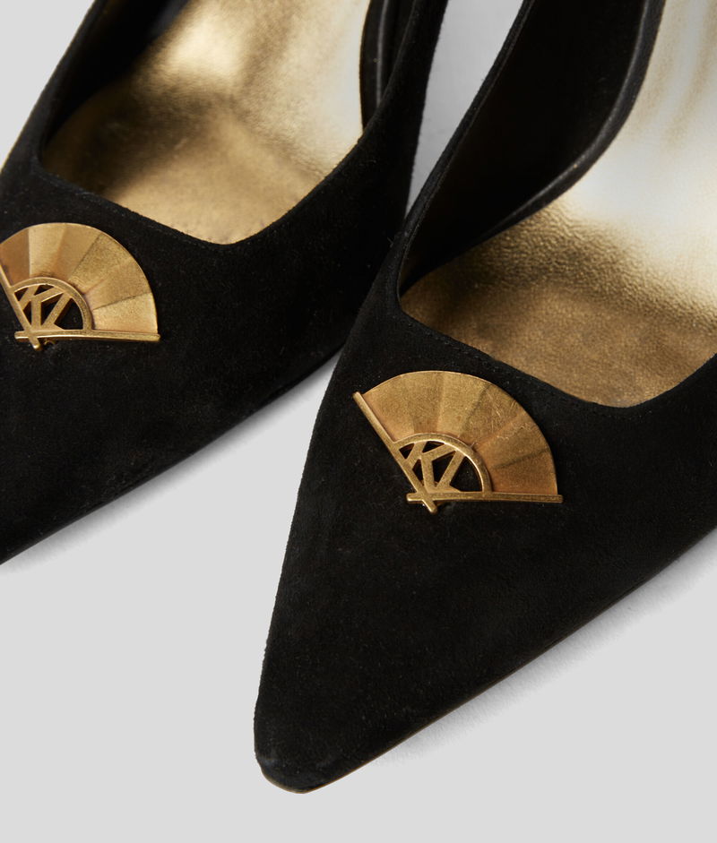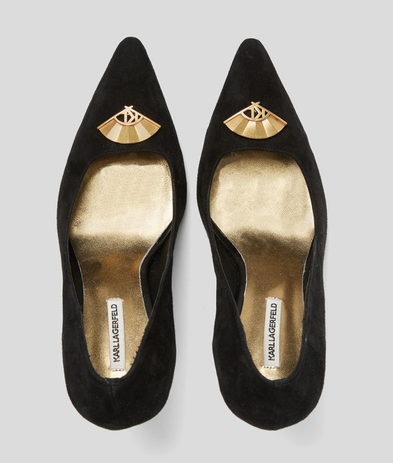 Complete statement-making looks with these rich suede court shoes topped with a fan embellishment and gold block heels.