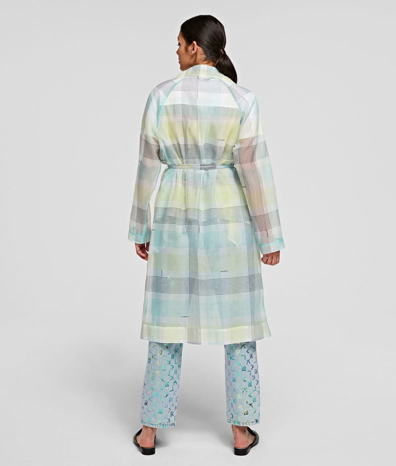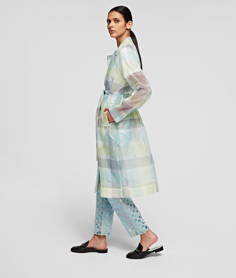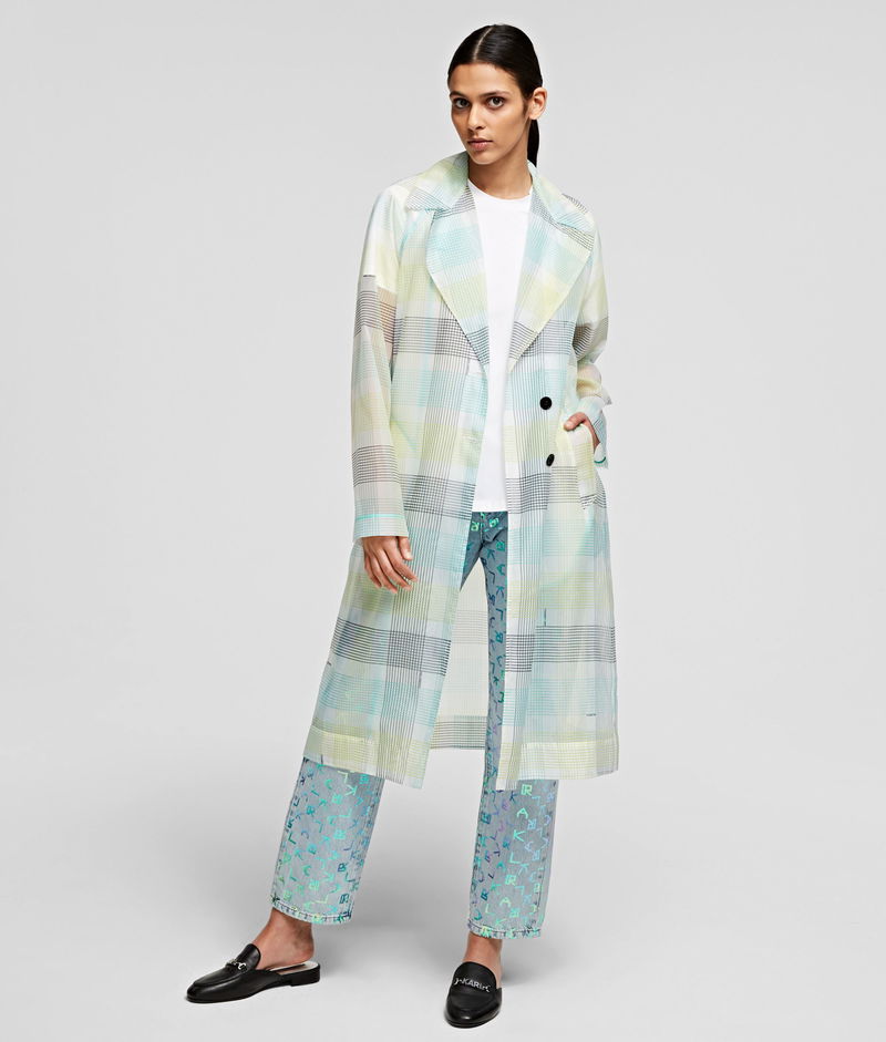 An elegant trench coat crafted from delicate and lightweight organza fabric, perfect for between-season styling. The trench silhouette is fastened with two buttons at the centre front, and completed by a tie belt for cinching in the waist.