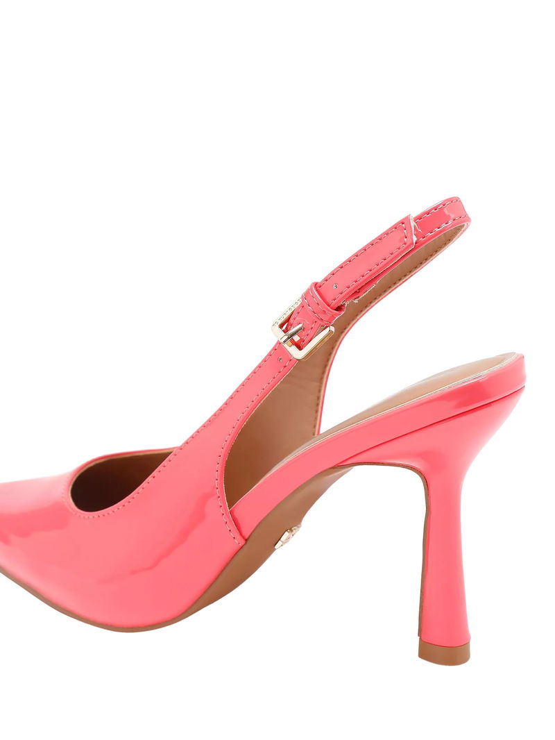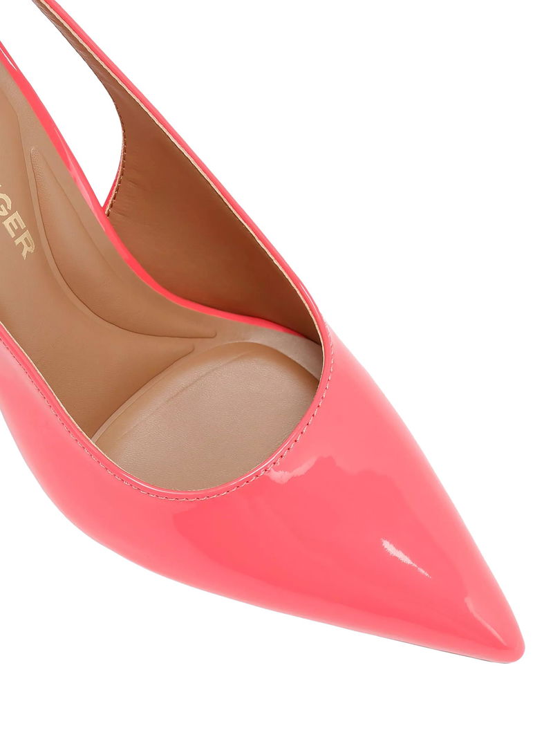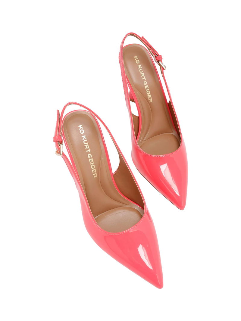 KG Kurt Geiger patent court shoes, featuring a pointed closed toe, high stiletto heel, and practical slingback.