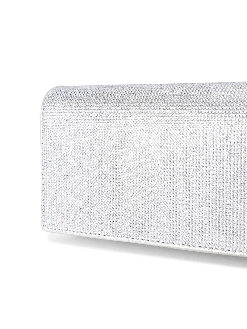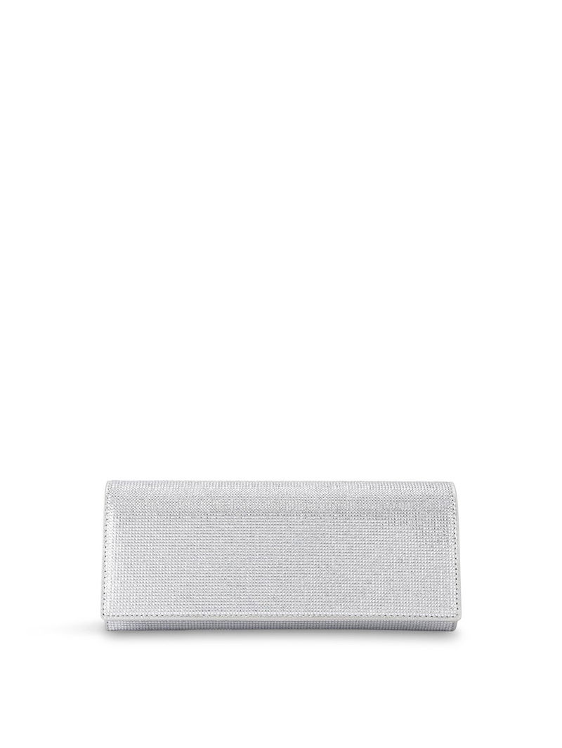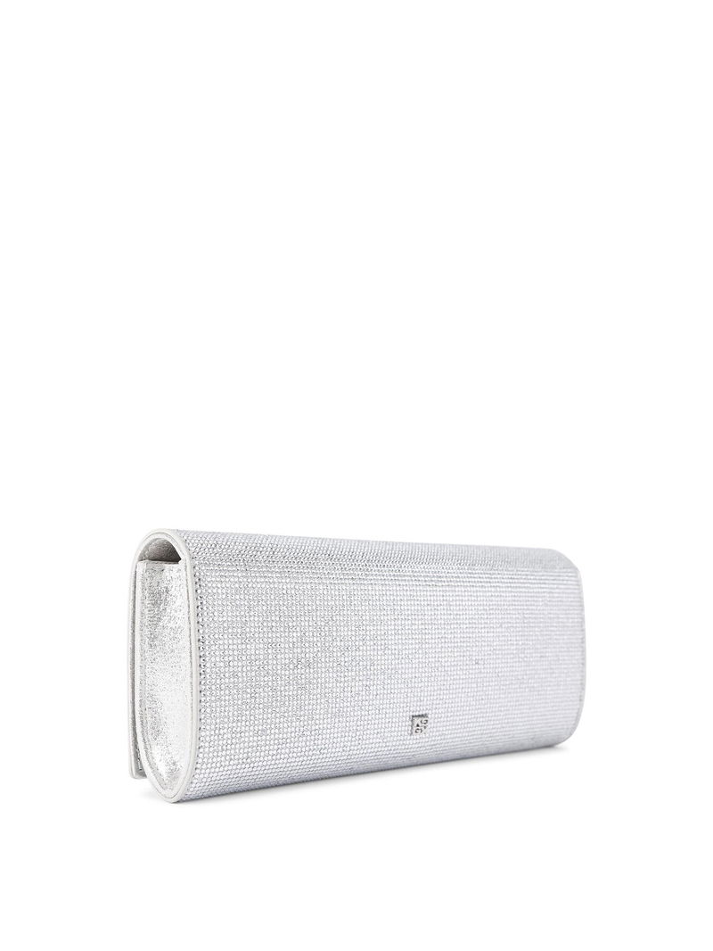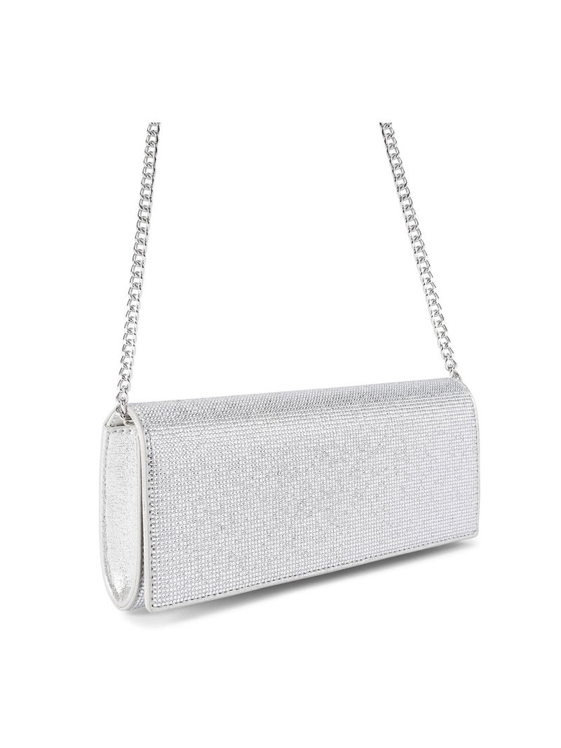 The KG Kurt Geiger Baily is an elongated clutch bag crafted from a silver fabric with crystal embellishment. There is a small KG Kurt Geiger pin stud on the back of the bag.