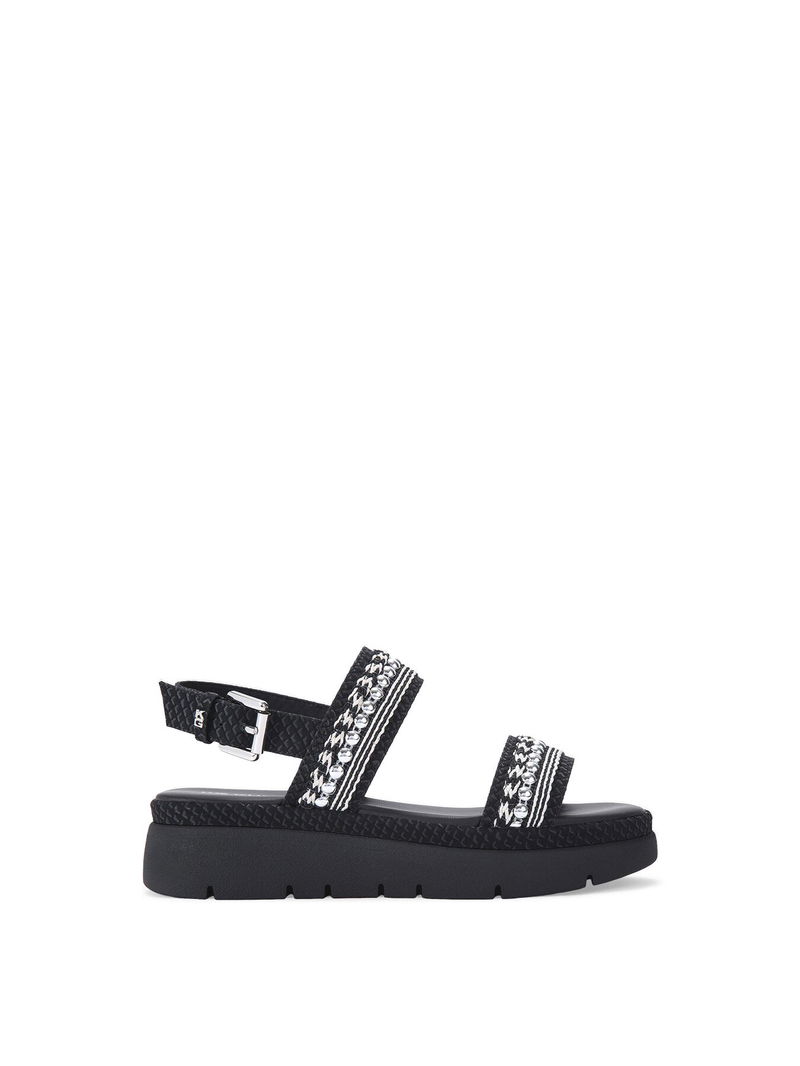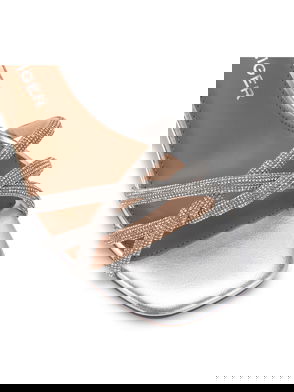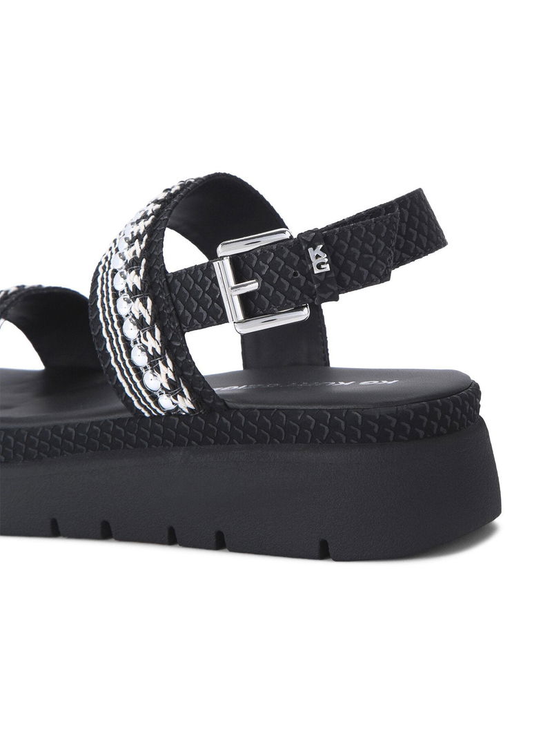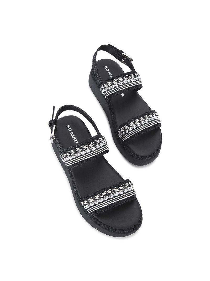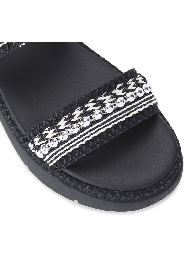 The KG Kurt Geiger Daisy Stud sandal has two strap across the foot which are embellished with braided rope and silver studs. The footbed is padded for comfort and there is slight lift to the sole.