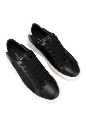 Product Details The Hype Sneaker from Kurt Geiger features a black leather upper with lace up front and blind eyelets. There is gold foil branding on the tongue and heel.