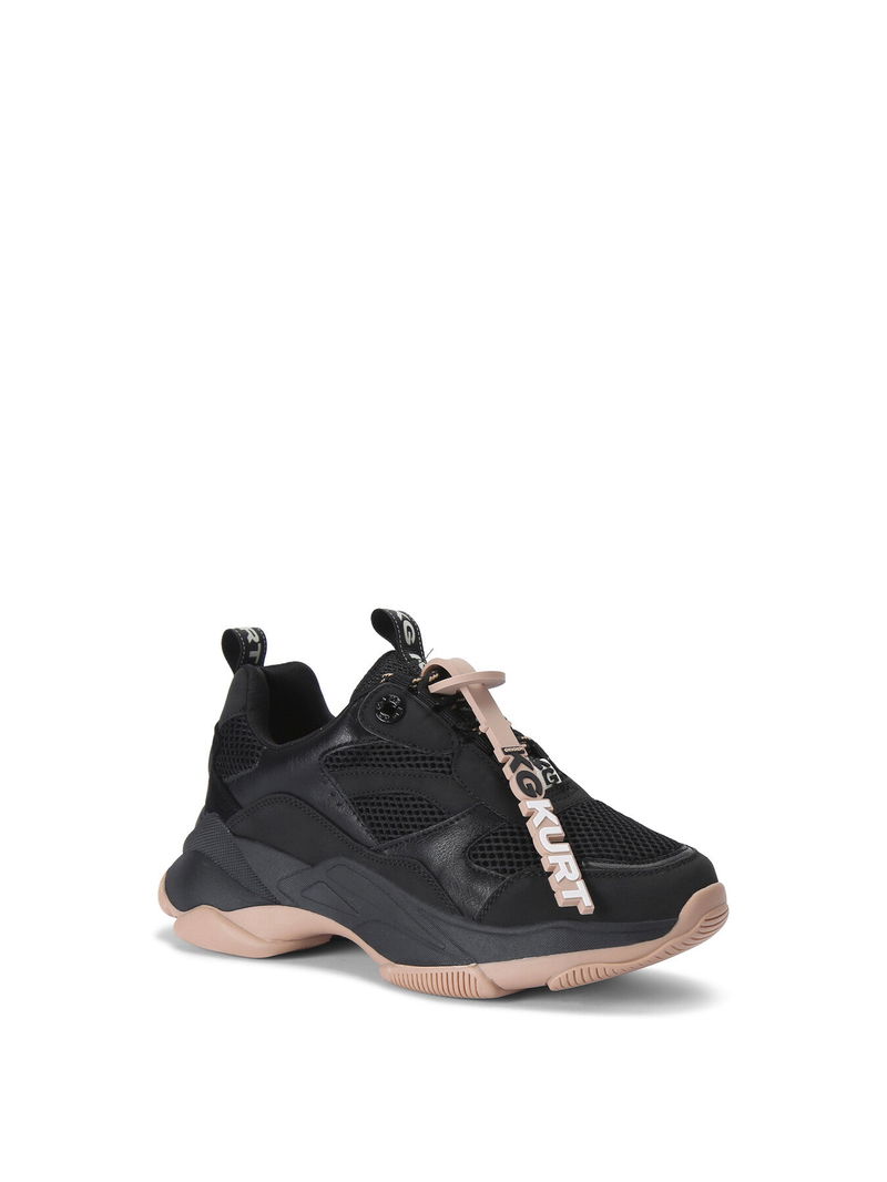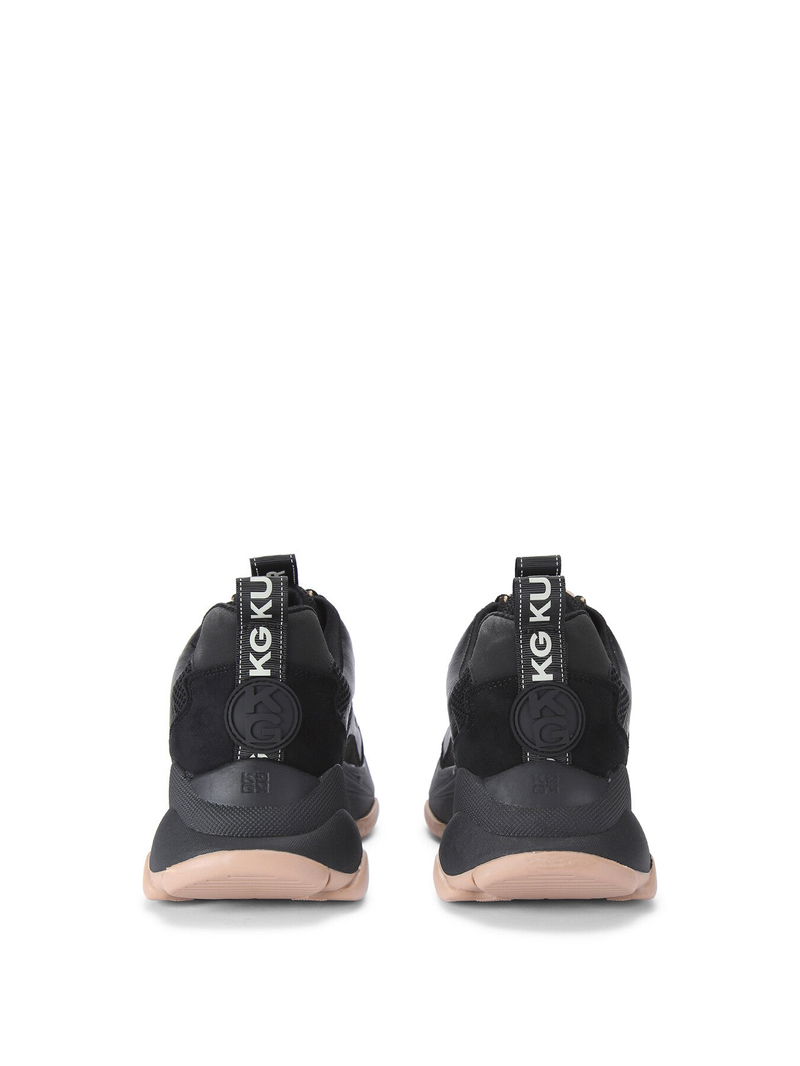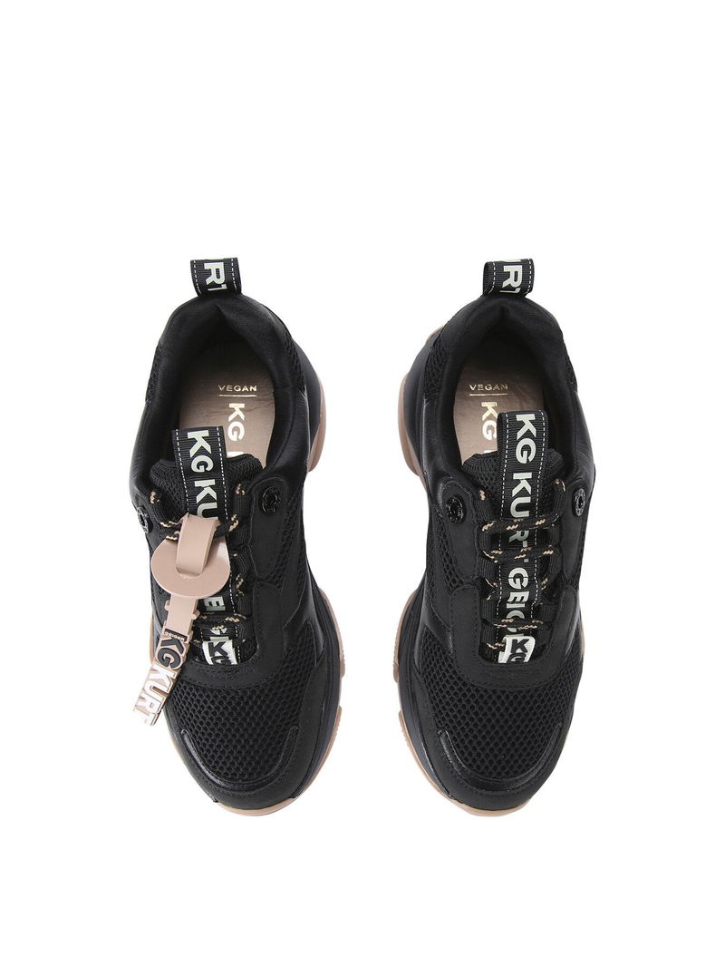 The KG Kurt Geiger Lila Lace Up sneaker features a black upper with KG Kurt Geiger branded tabs on the front and back of the shoe. The whole is chunky in black with a nude outsole.