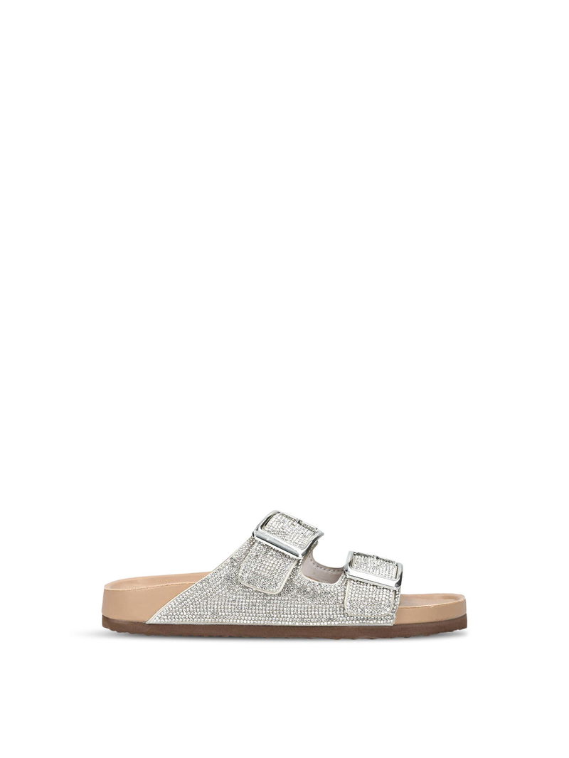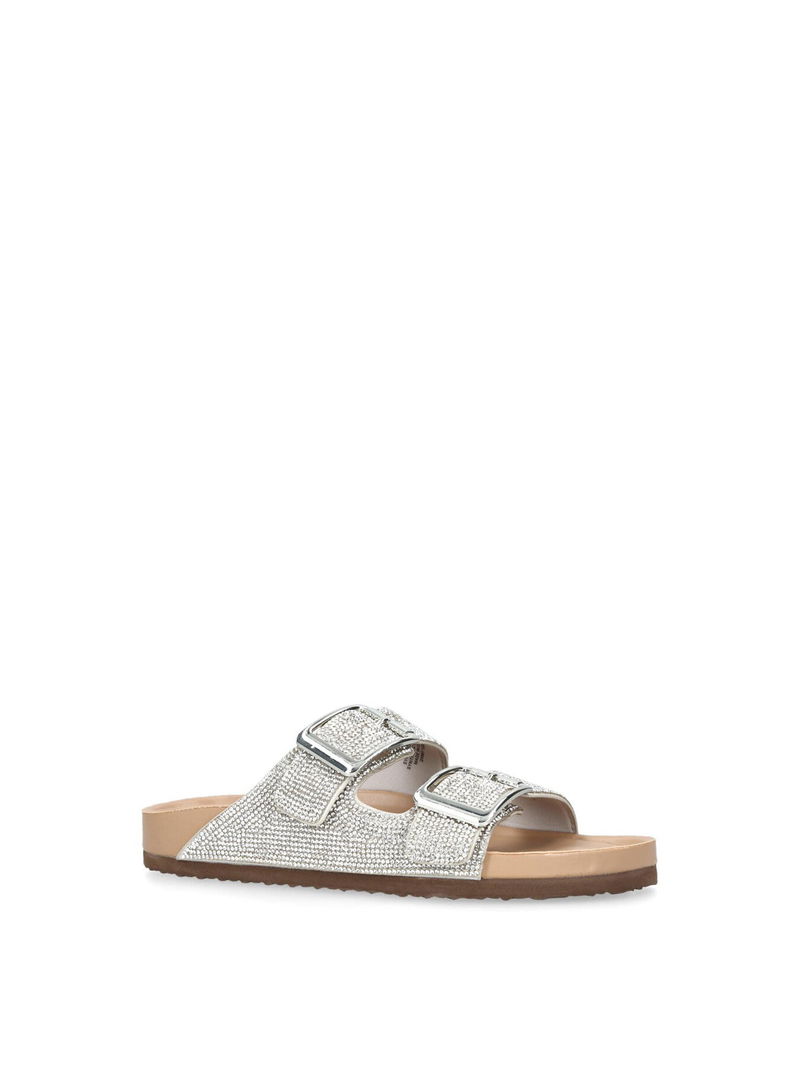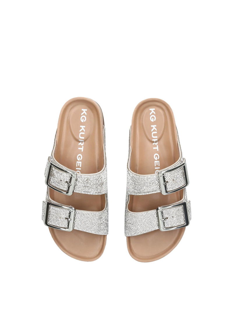 This KG Kurt Geiger Ramona Bling slip on sandal features a fabric upper with two crystal embellished straps across the foot. The straps each feature a large buckle which can be adjusted.