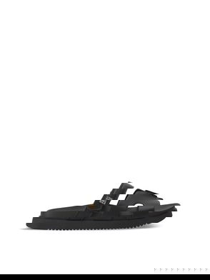 The Raquel is a chunky black slide-on sandal crafted from knitted fabric. There are two large gold buckles on each of the straps and the footbed is moulded for comfort.