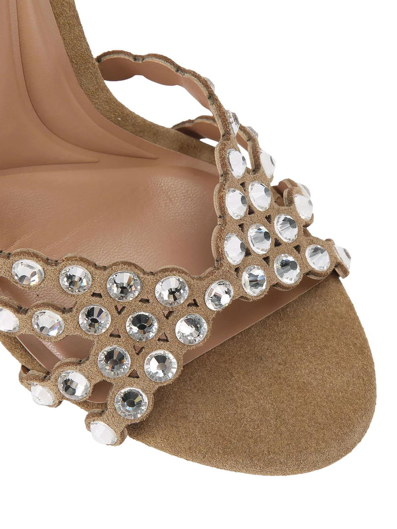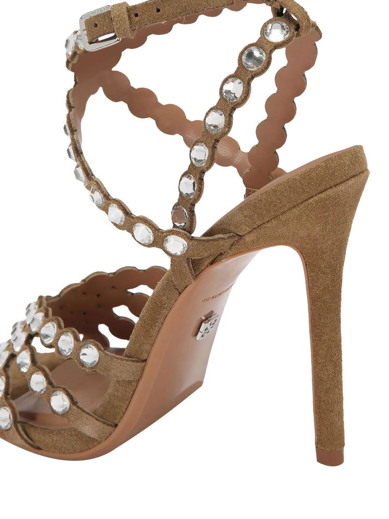 Slideaway Suede Embellished Stiletto Heel Sandals, Brown Camel