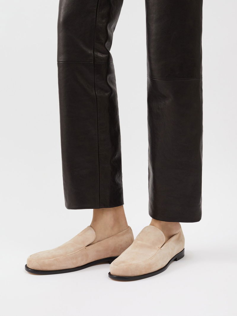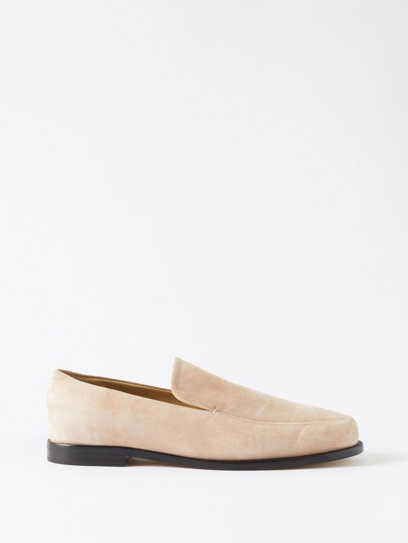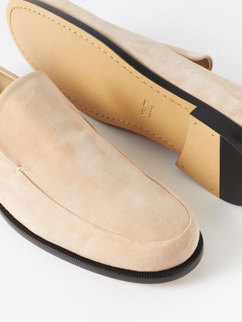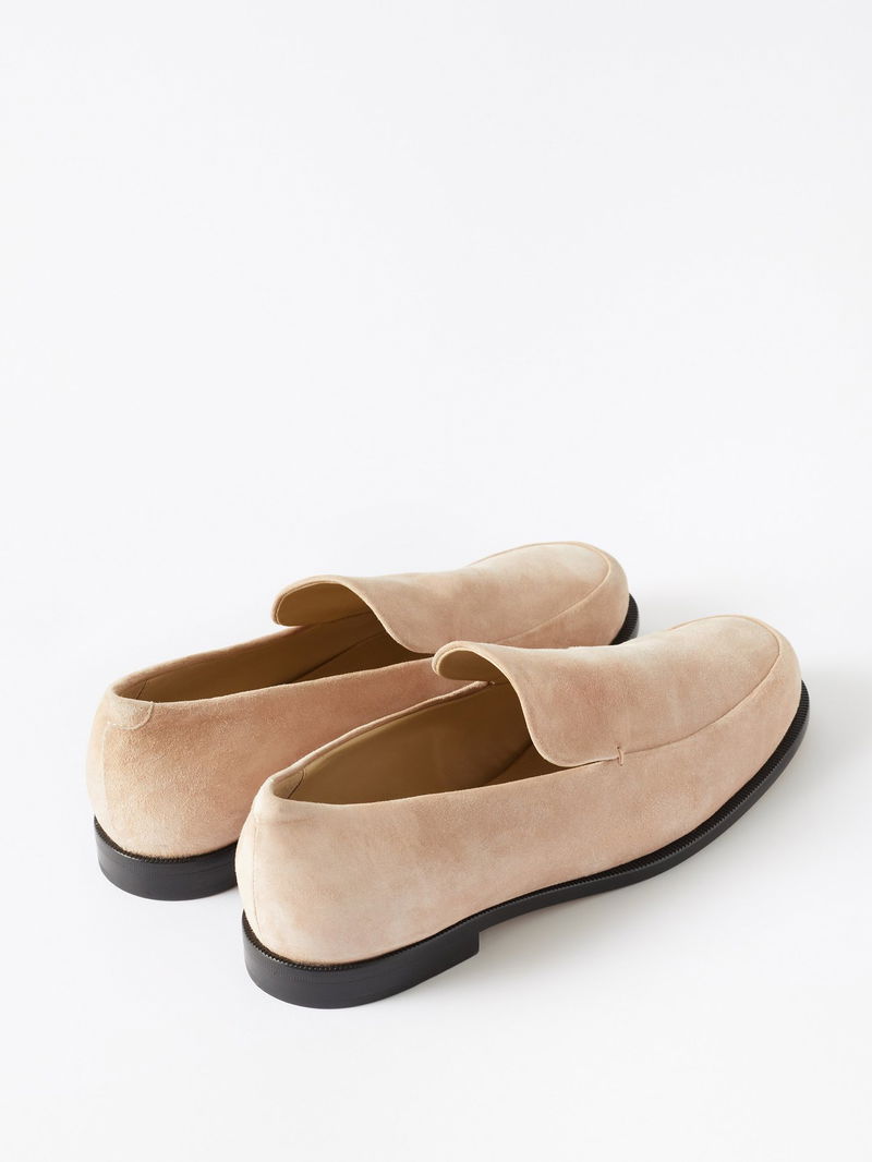 Look to Manhattan-based label Khaite for timeless, elegant footwear options, such as these beige round-toe suede Alessio loafers.