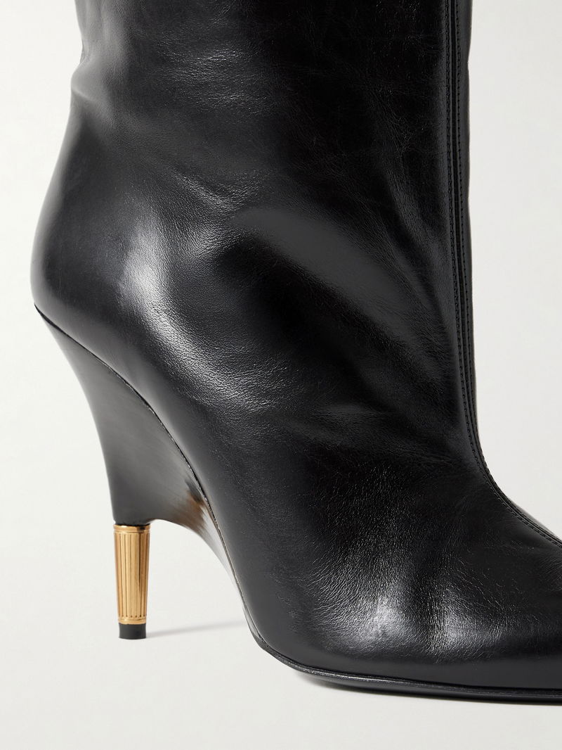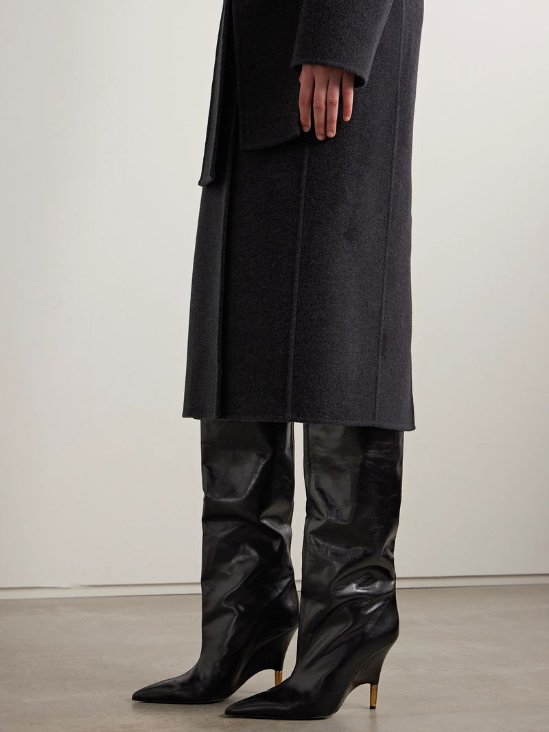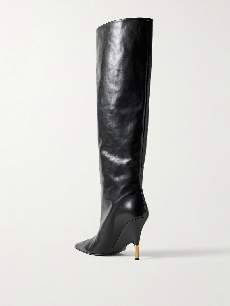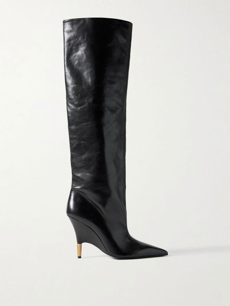 KHAITE's 'Bella' knee boots have carved gold-tone heels that are almost fully encased, creating the illusion of a wedge at first glance. They've been made in Italy from black leather with a wide shaft and sharply pointed toes. Style yours with mini skirts or slim-leg jeans.