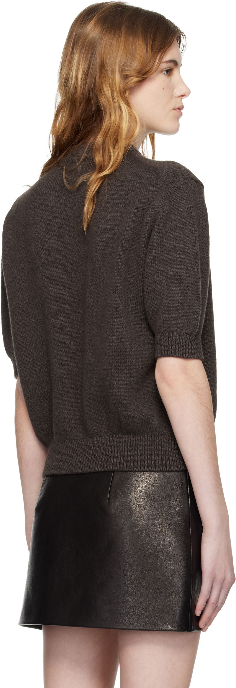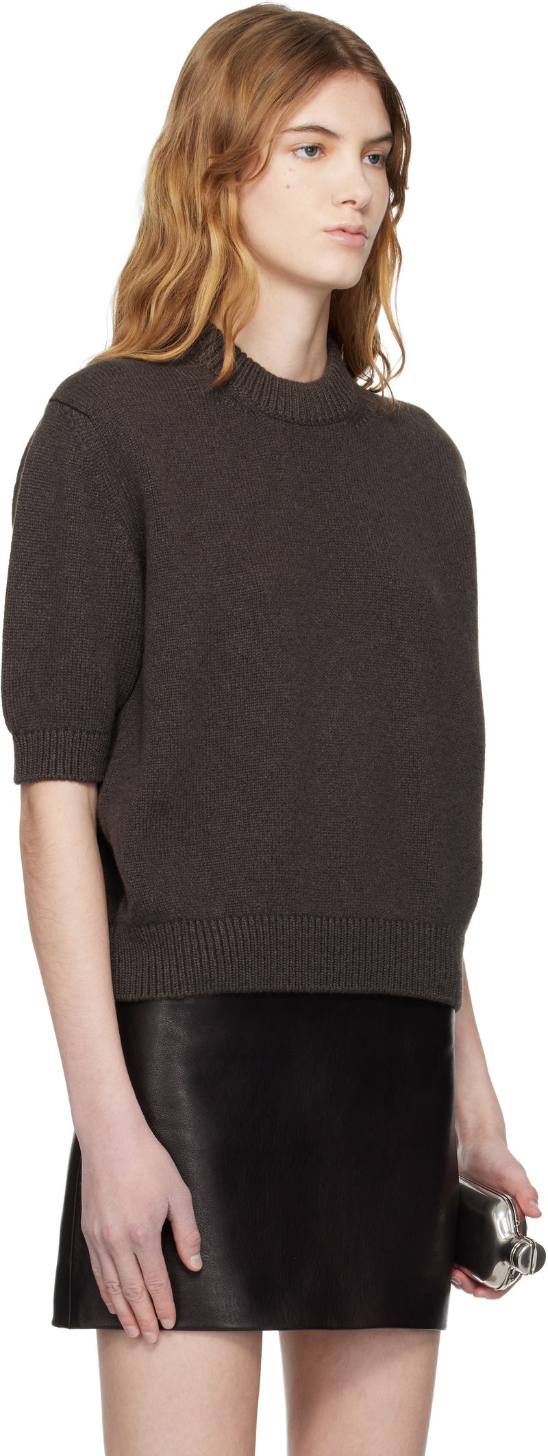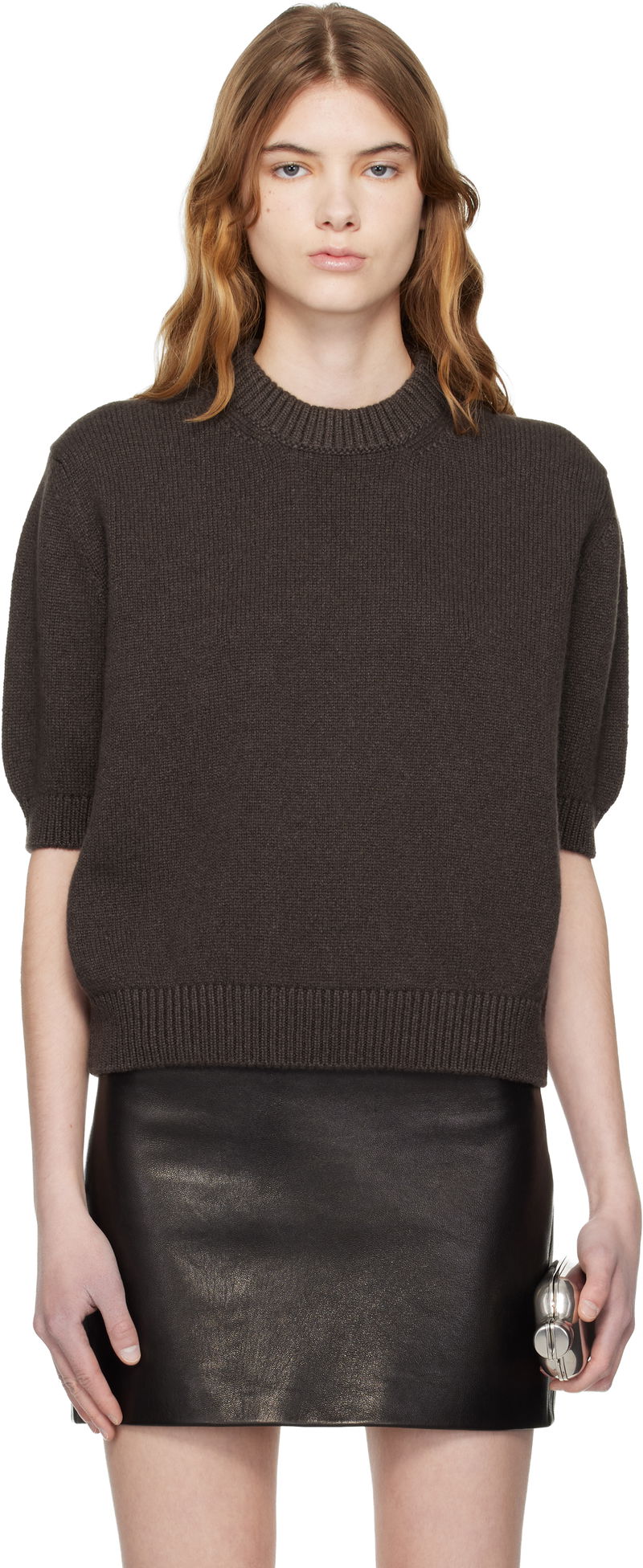 Knit cashmere sweater. Rib-knit crewneck, hem, and cuffs.
