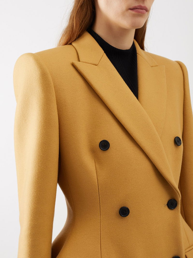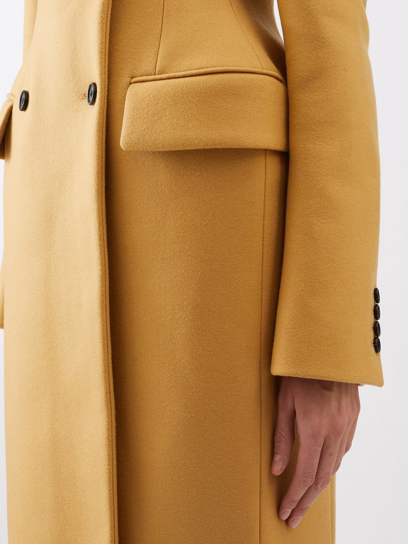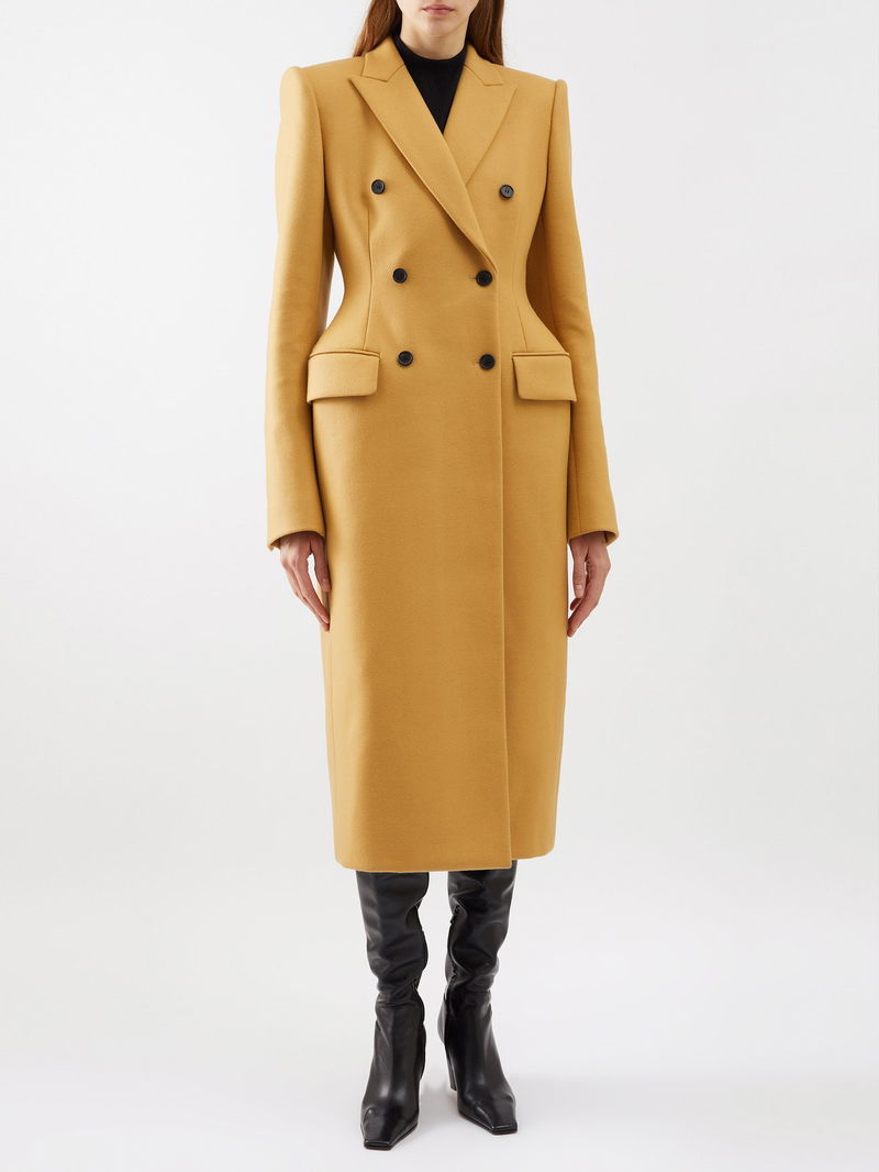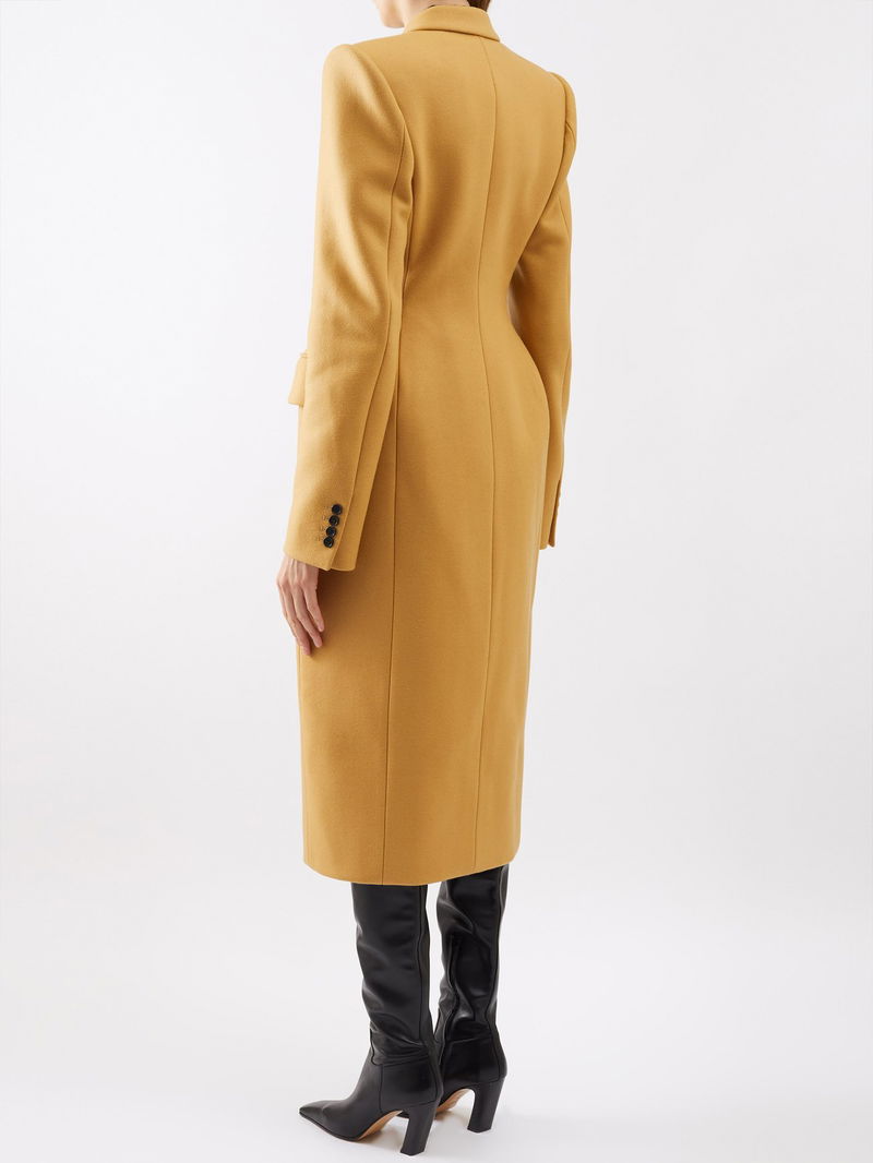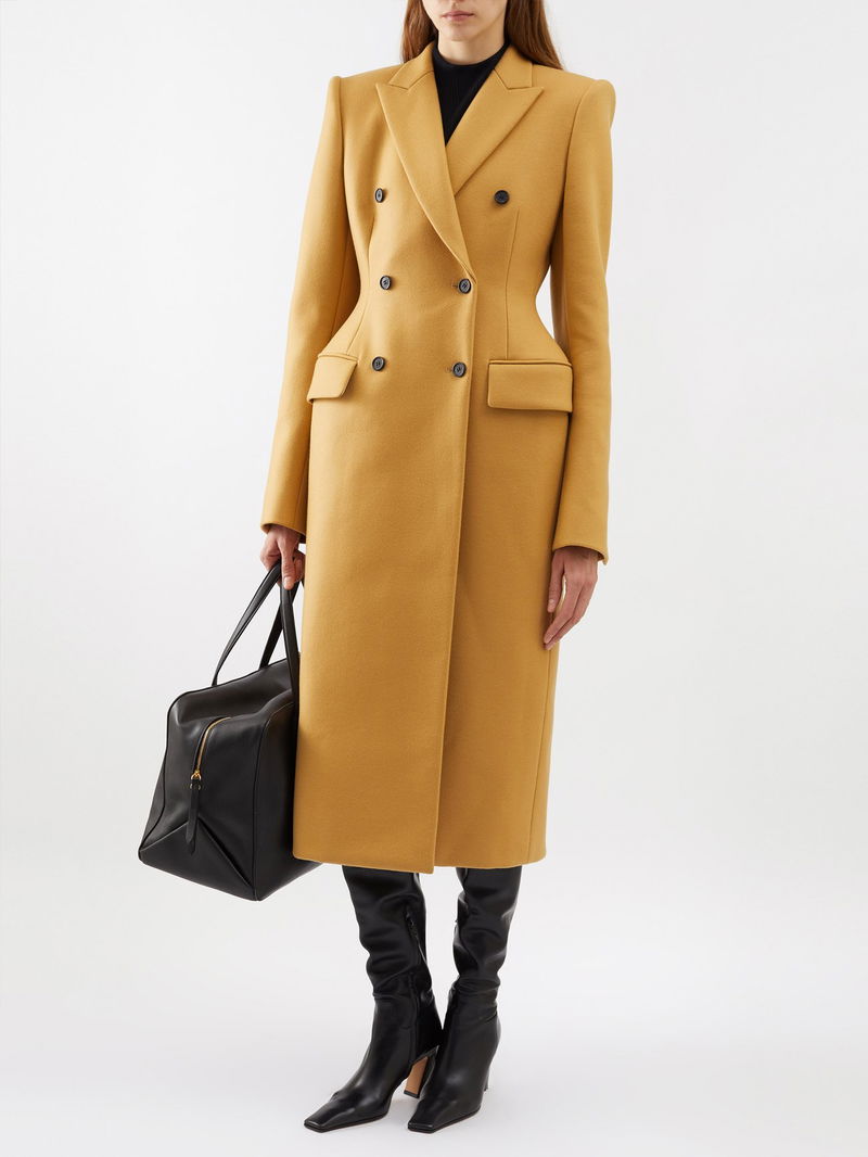 Khaite subverts classic tailoring codes for the AW23 collection, as seen in the ultra-sculpted waist of this camel Carmona coat.