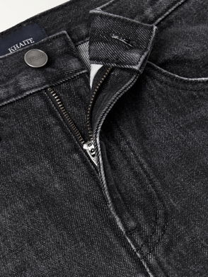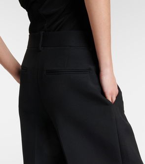 KHAITE stretch-woven trousers. Button, hook-and-eye and zip-fly fastening at front. Relaxed fit, high rise, wide tapered leg, belt loops, for knife pleats at front, centre pleats at front and back, two slip pockets at sides, two buttoned welt pockets at back, partially lined.