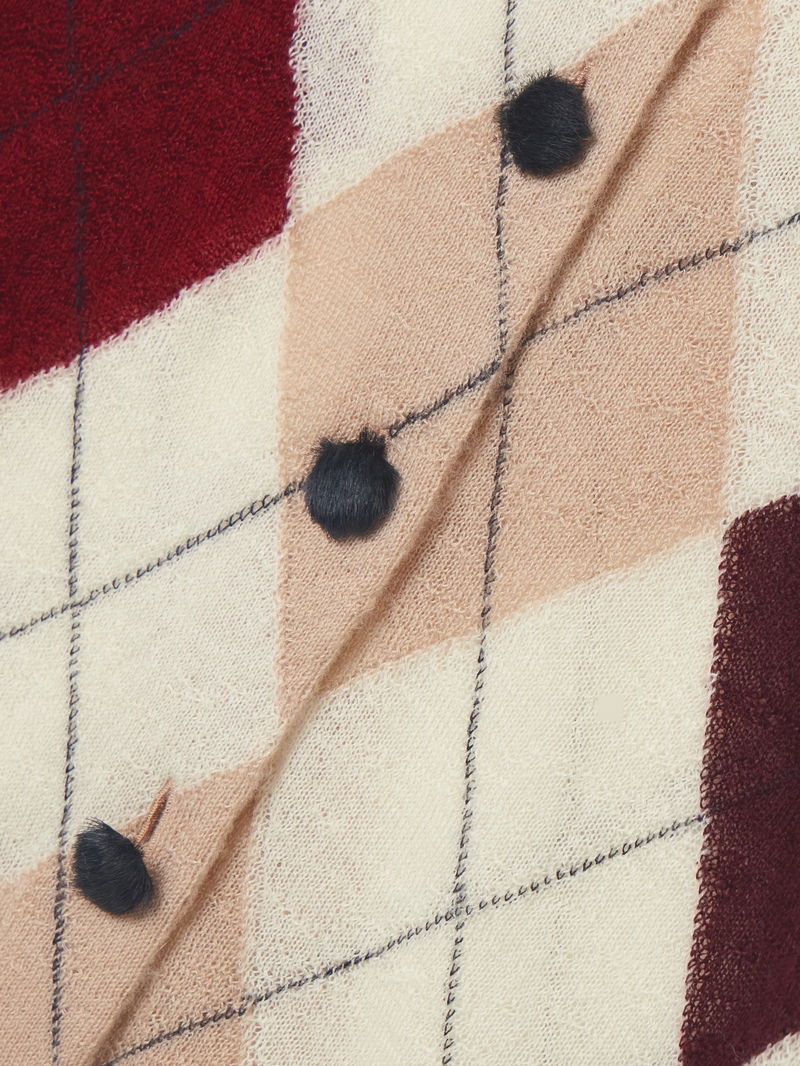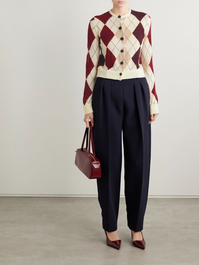 KHAITE's Fall '25 collection is largely inspired by the works of late American filmmaker David Lynch. This 'Charli' cardigan is made from cashmere and mohair-blend and jacquard-knitted with preppy argyle checks. The fuzzy calf hair buttons add a cool, tactile finish.