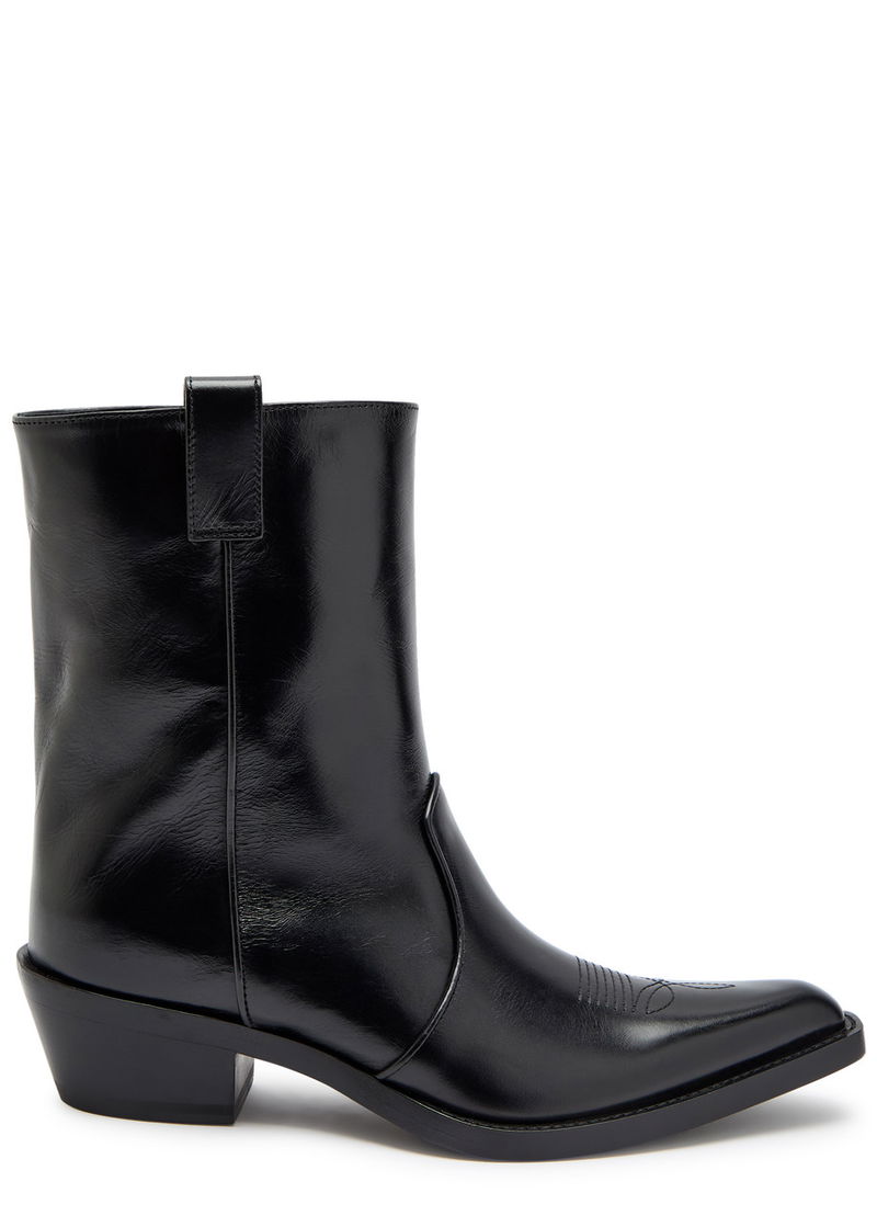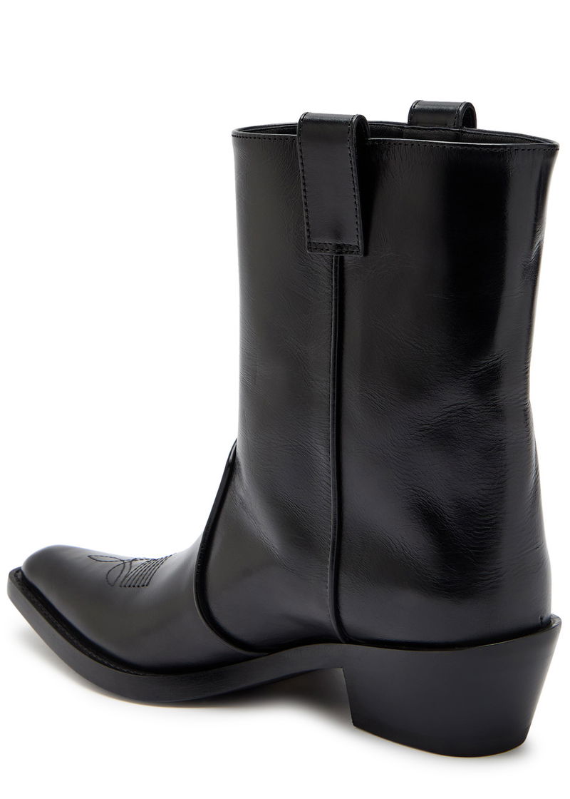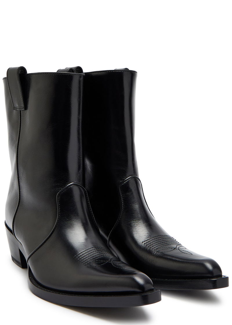KHAITE leather ankle boots. Block heel measures approximately 1.5 inches/ 35mm. Western-style panels, embroidery, side tabs at ankle, stacked wooden midsole, pointed square toe.