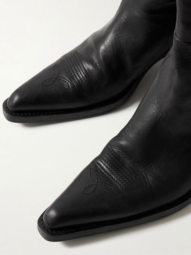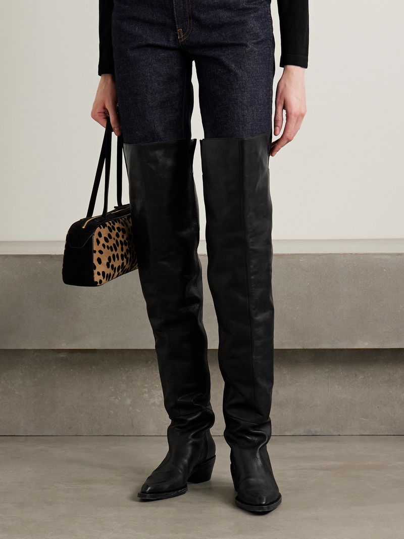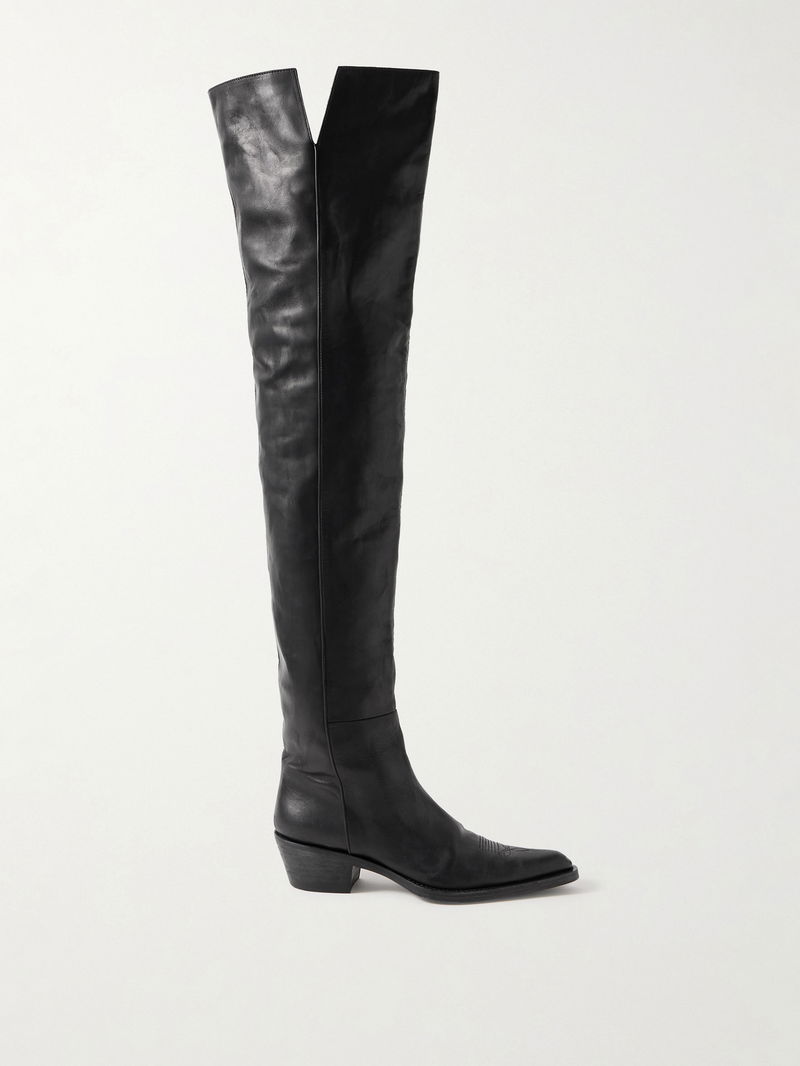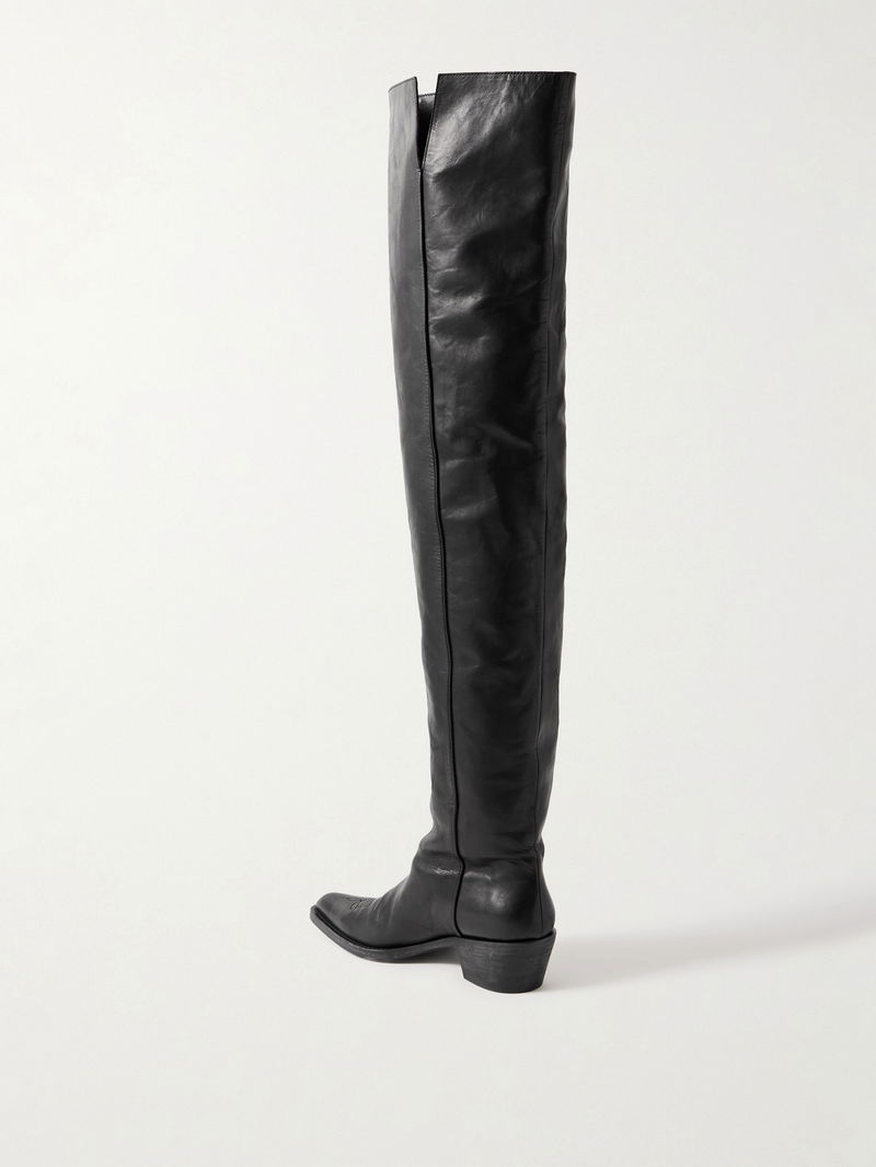 KHAITE's 'Clive' over-the-knee boots were styled with multiple looks on the Fall '25 runway, proving just how versatile they'll be in your own wardrobe. They've been made in Italy from supple black leather and have Western-inspired stitching on the pointed toes. Slits at the very top ensure comfortable movement.