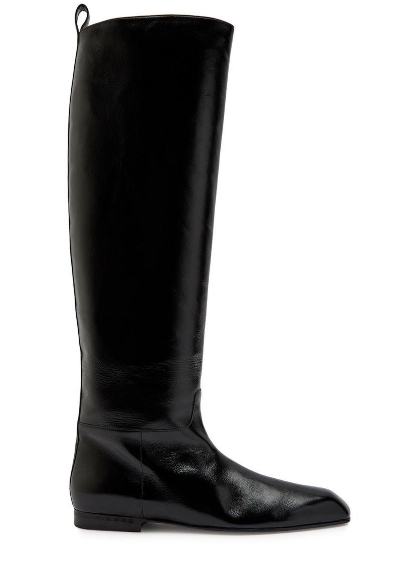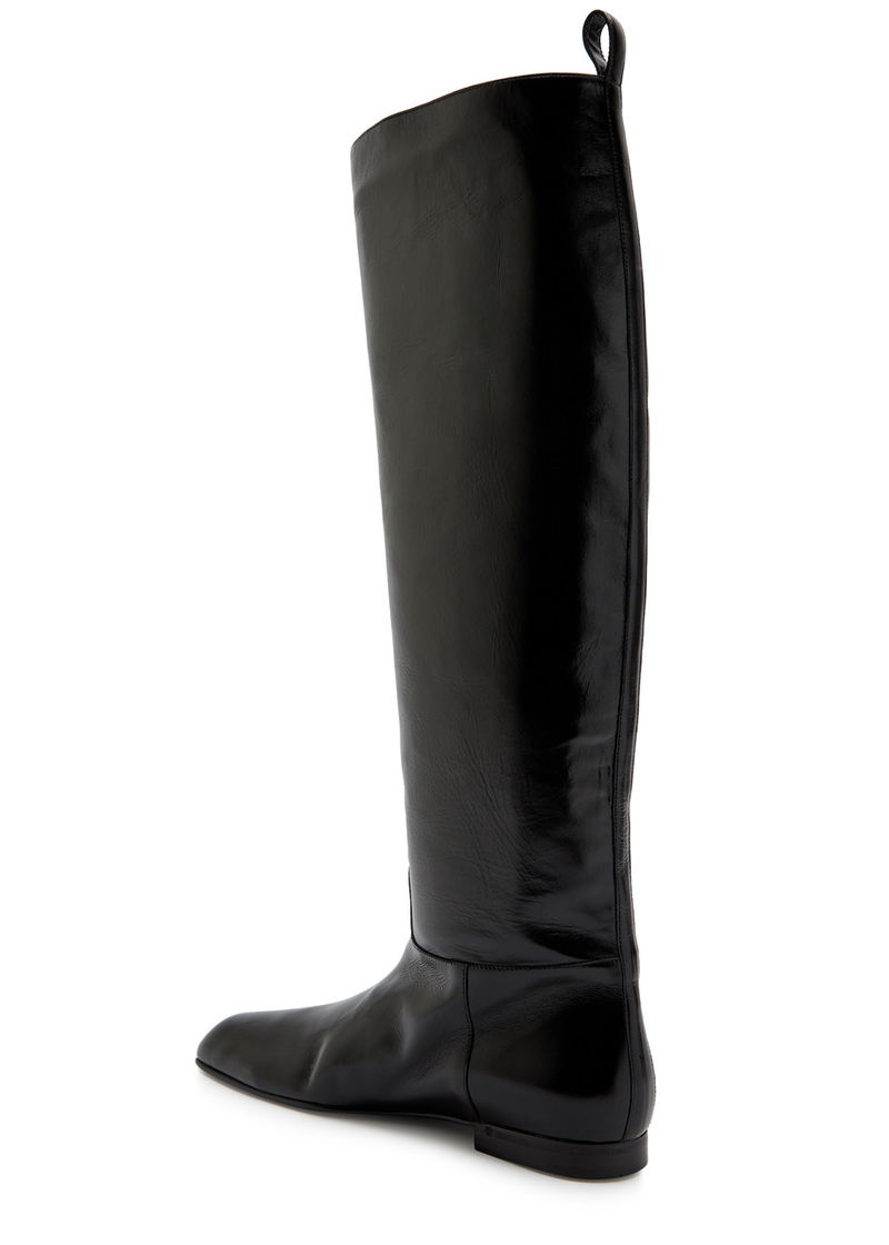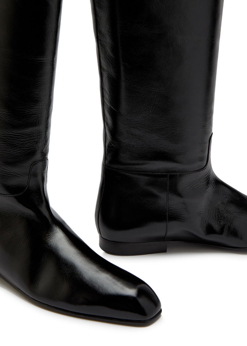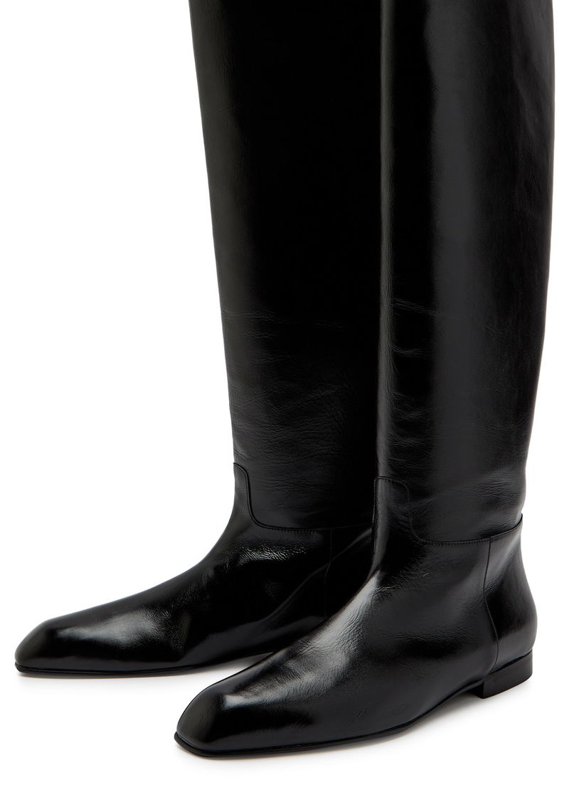 KHAITE glossed leather knee-high boots. Heel tab at top, pointed square-toe.