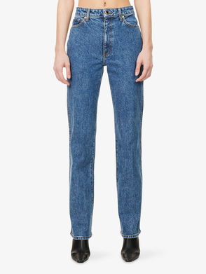 Khaite denim jeans. High-rise fit, straight-leg cut, belt loops, five pockets, contrast stitching, distressed and faded finish Partially concealed button and zip fastenings at front.