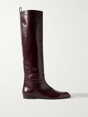 Khaite riffs on equestrian codes with these black leather Derby knee-high boots, named after the Derby Stakes run at Epsom Downs Racecourse in England. They're crafted in Italy with a stacked leather, crepe and rubber sole which extends to frame and protect the rounded toe from scuffing.