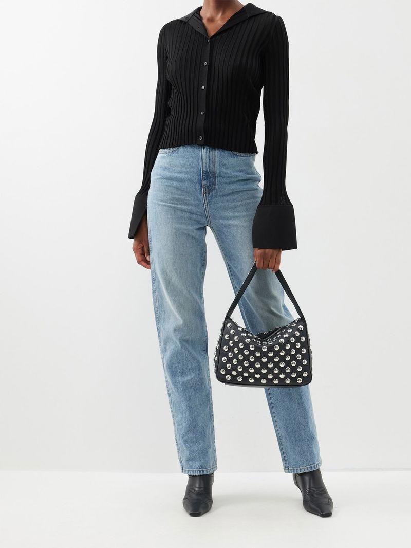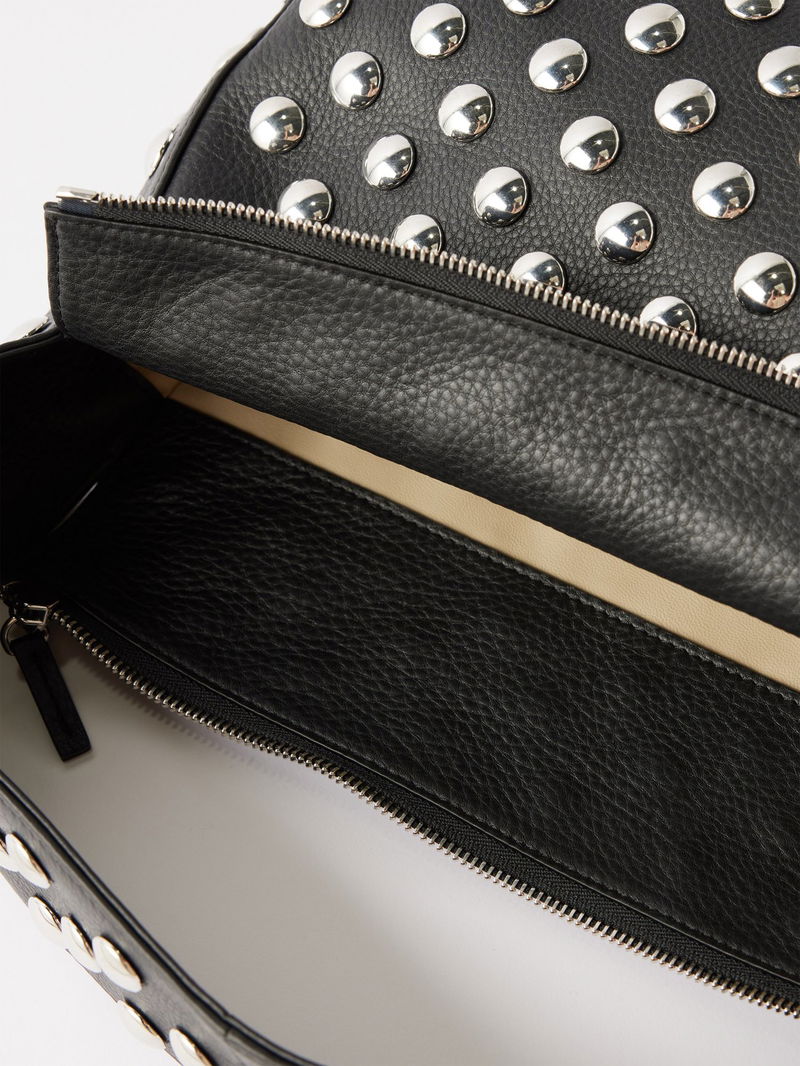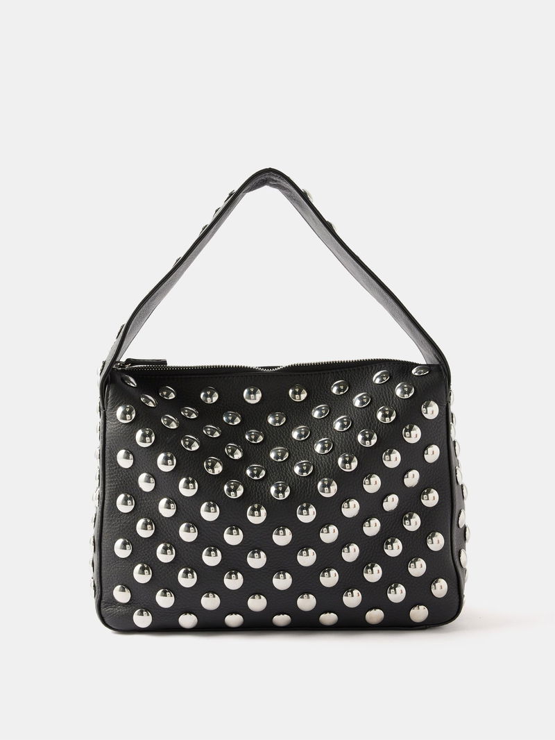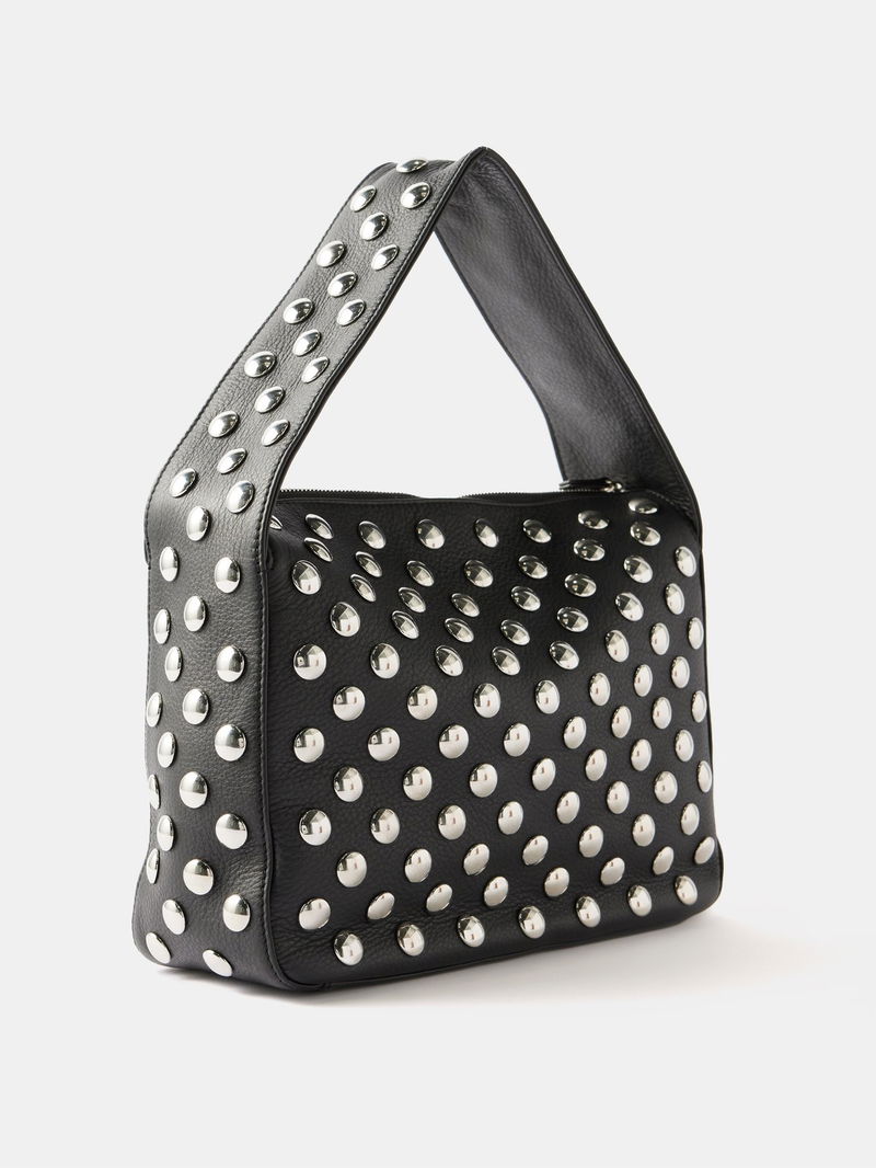 The slouchy frame of Khaite's black calfskin leather Elena shoulder bag is elevated with round silver studs for a subtle rebellious twist.