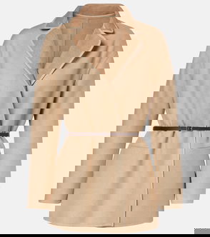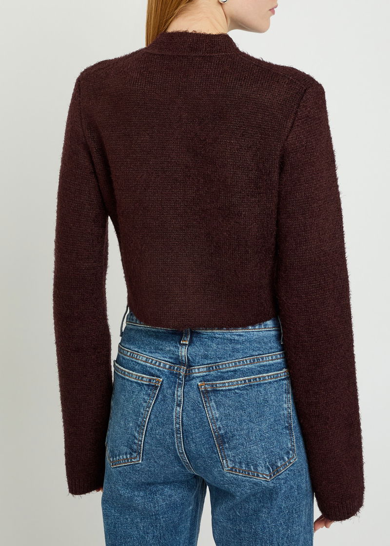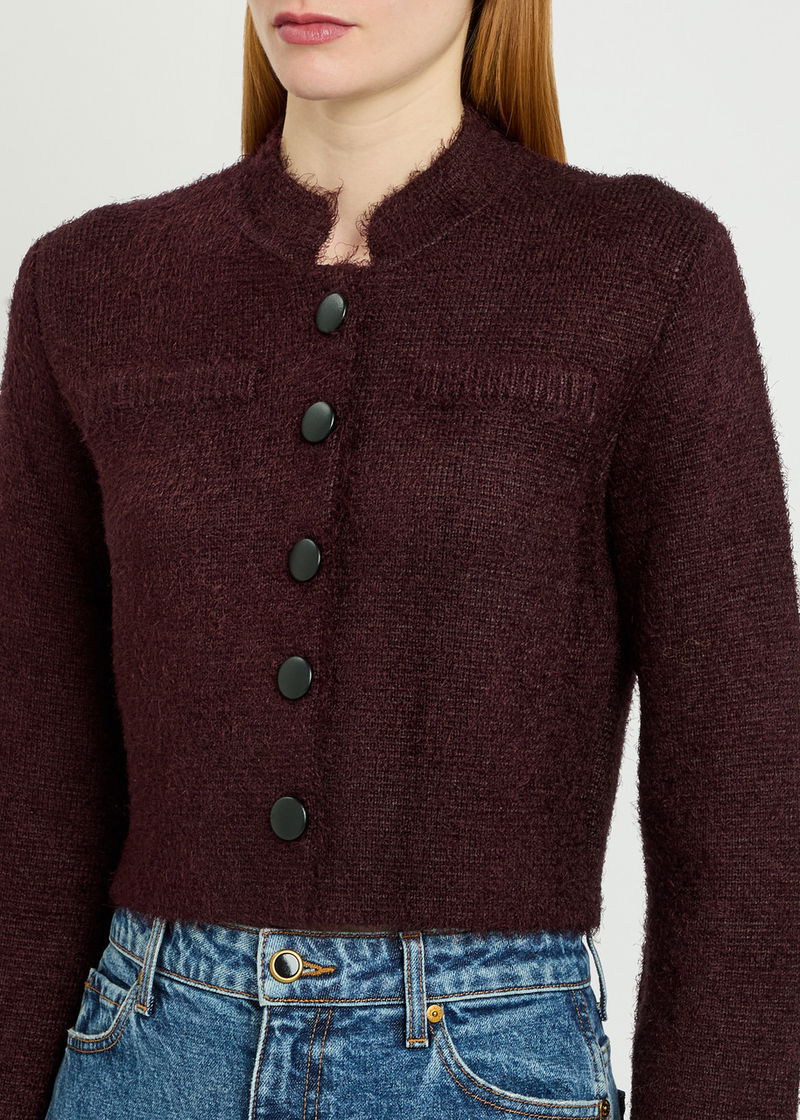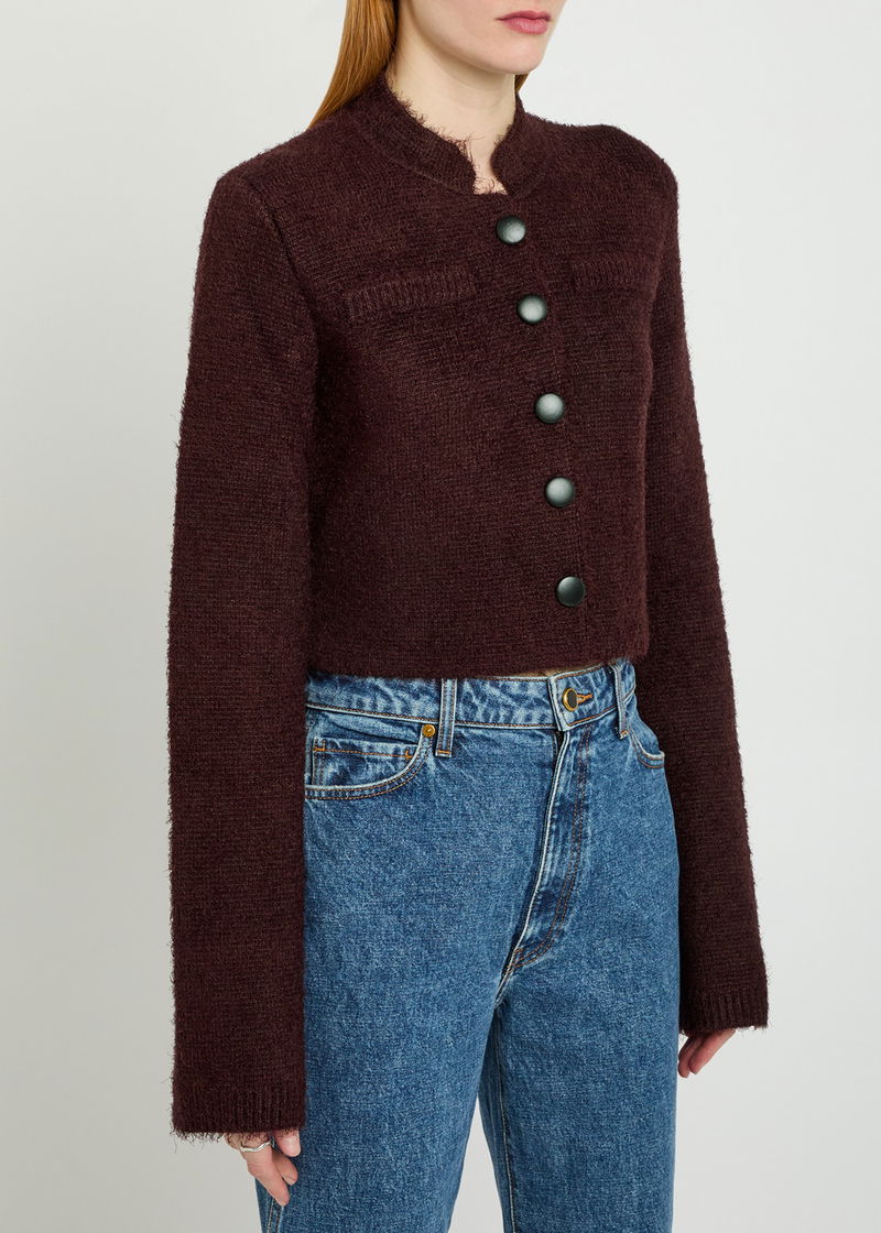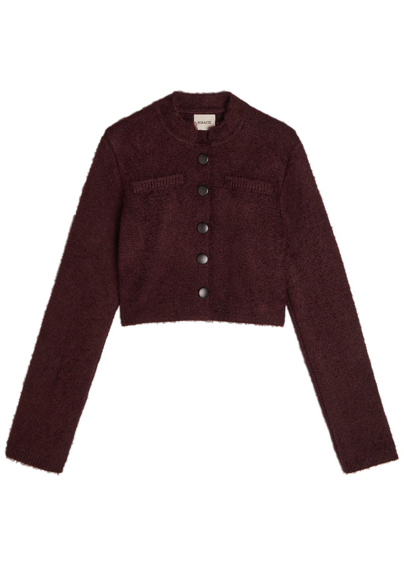 KHAITE silk and cashmere-blend jacket. Stand collar at round-neck, faux slit pocket at chest, ribbed trims. Button fastenings through front.