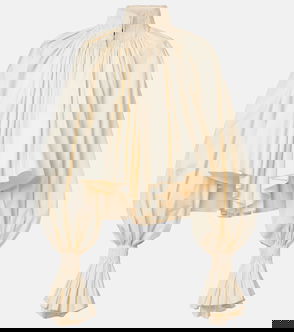 A romantic air pervades Khaite’s ivory Fanny blouse, which has a tulle yoke that’s swept into gossamer gathers by a velvet ribbon at the neck. Crafted from Italian satin-back crepe for a smooth feel against the skin, it has flatteringly ruched sleeves and a peplum that flares from the empire bust.