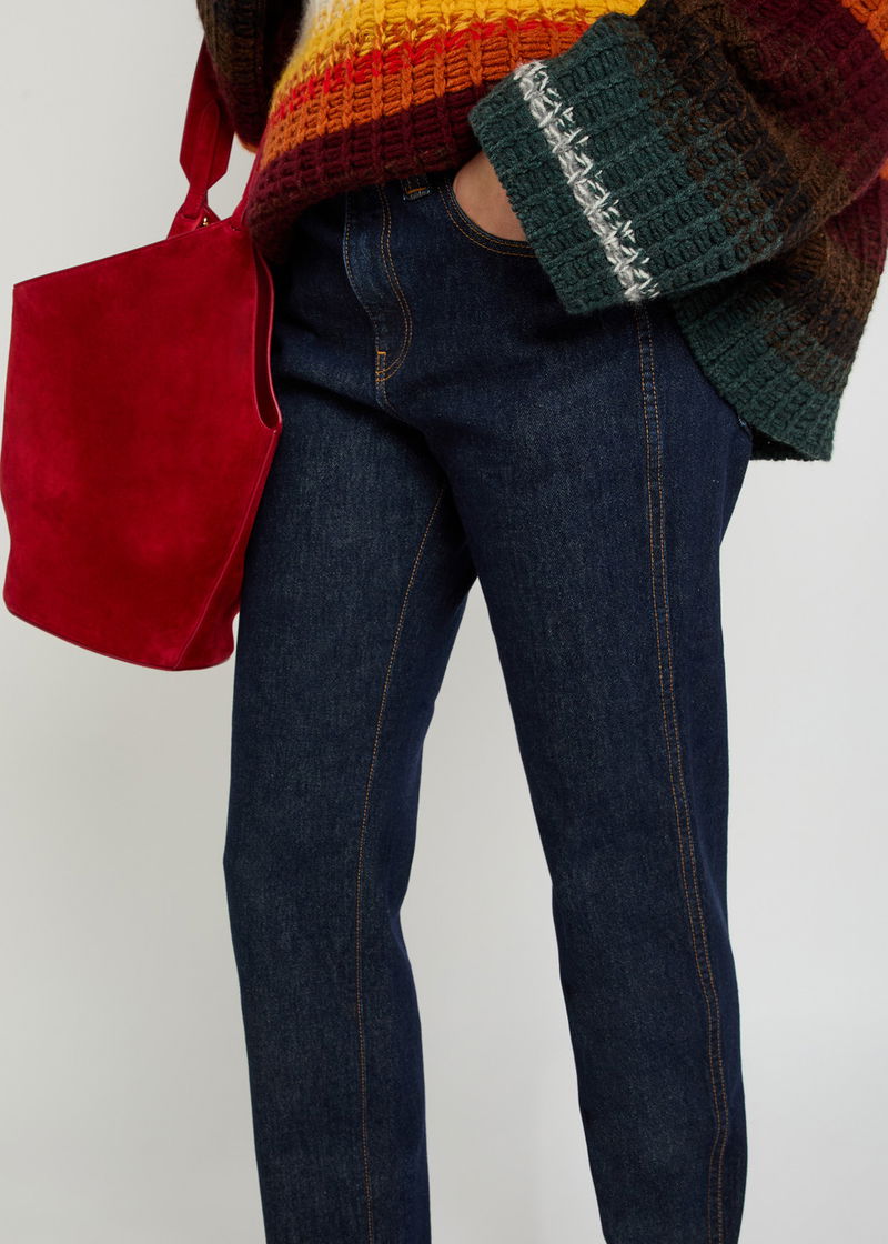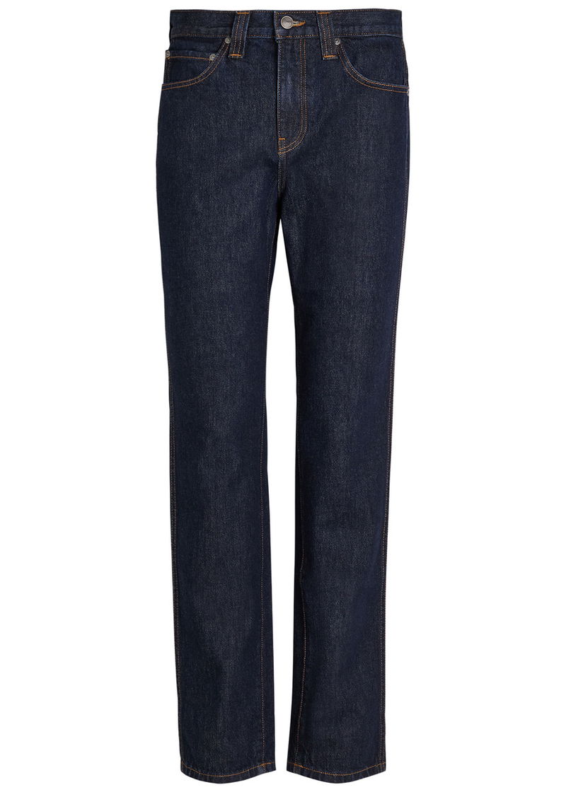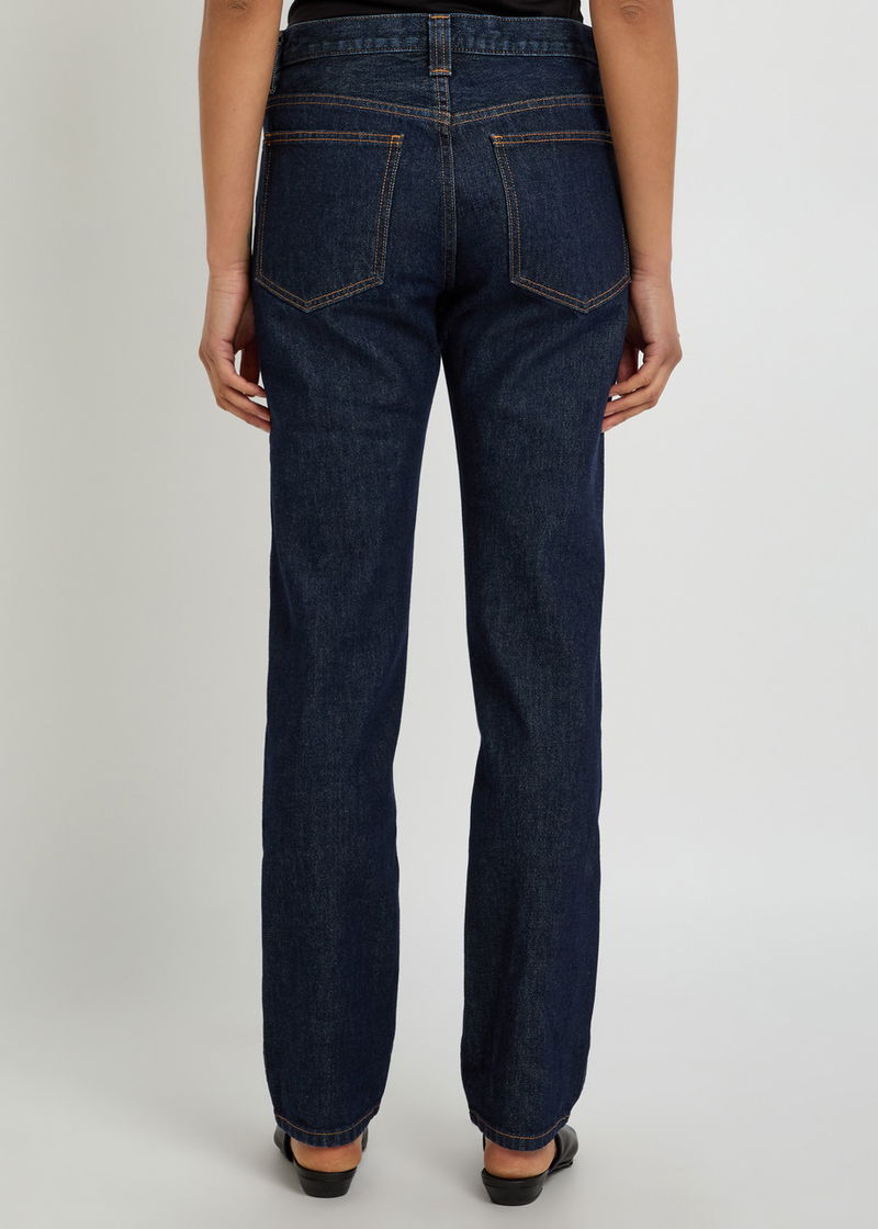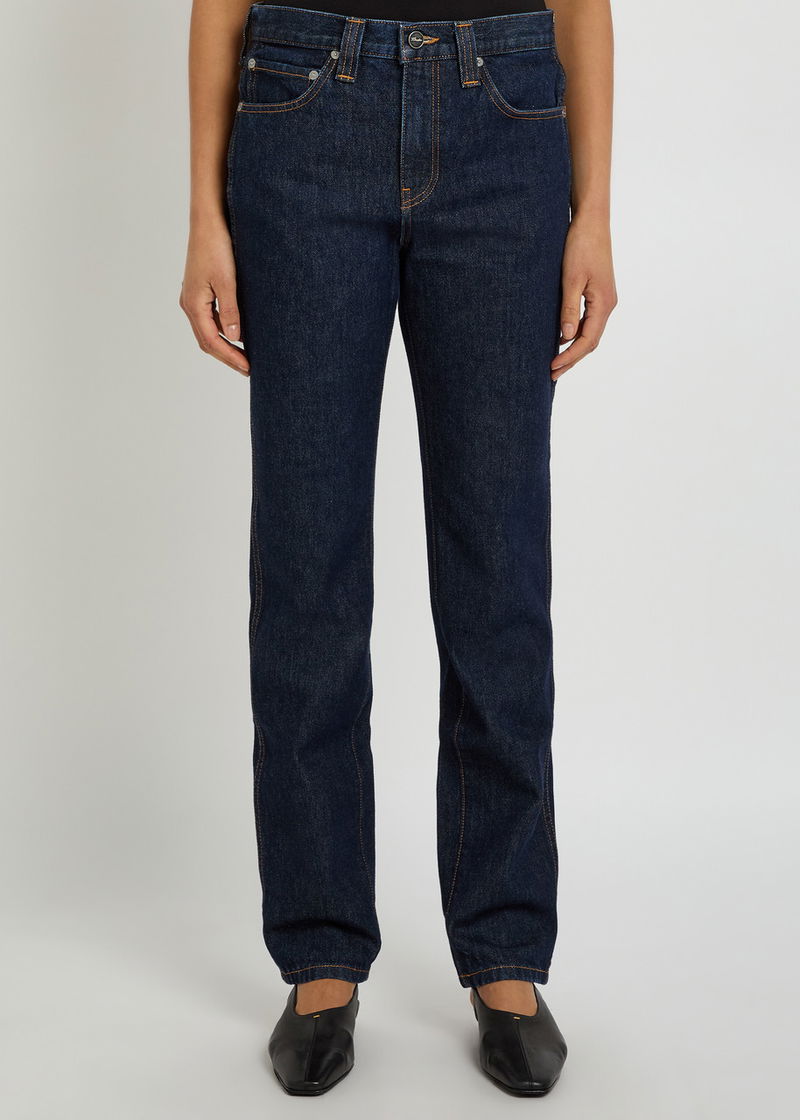 KHAITE denim jeans. High-rise fit, slim straight-leg cut, belt loops, five pockets. Partially concealed zip and button fastening at front