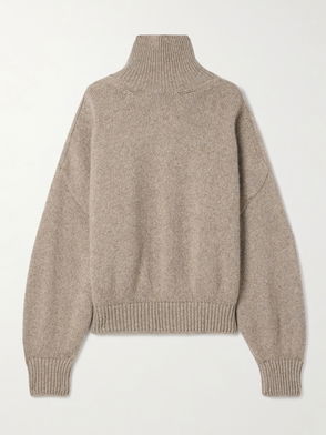 The relaxed fit of Khaite's grey cashmere Lima sweater reflects Catherine Holstein's exploration of feminine design nuances and masculine shapes. It's knitted in Mongolia where the specialist fibres are sourced and shaped to a boxy silhouette framed by a chunky rib-knitted roll neck, exaggerated sleeves and coordinating cuffs.