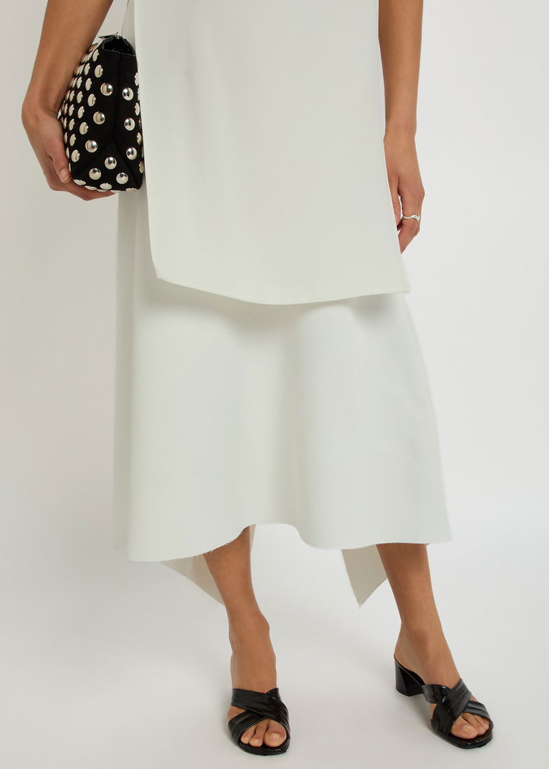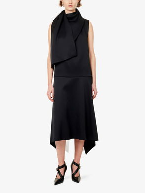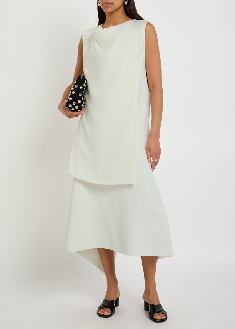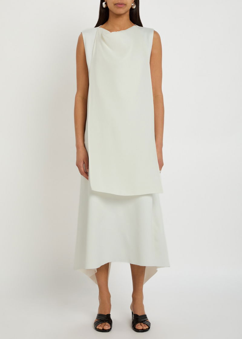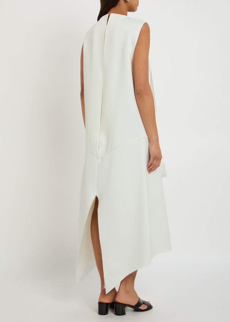 KHAITE crepe de chine dress. Draped front panel at round-neck, button-fastening keyhole at back, back vent, asymmetric hem, fully lined.