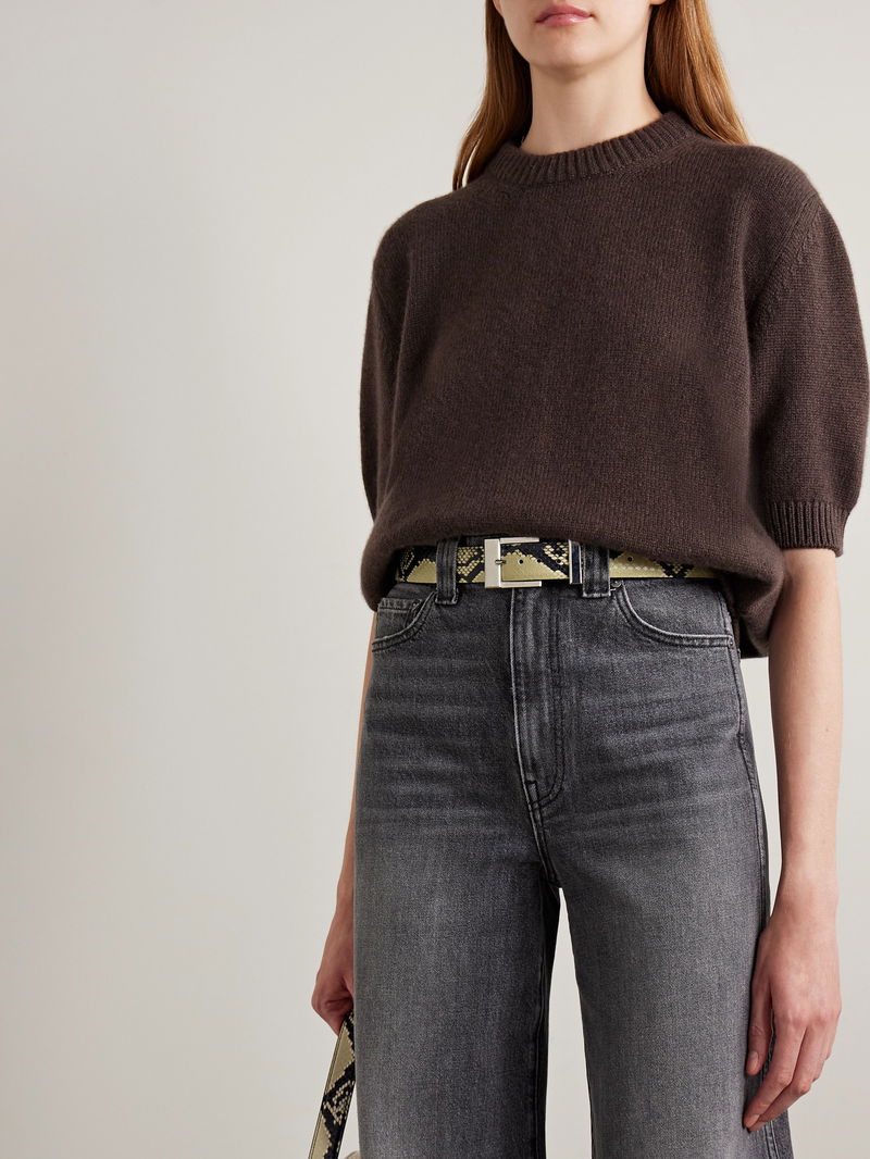 KHAITE's 'Manhattan' belt is a versatile, refined accessory that complements a variety of outfits. It's crafted from snake-effect leather and features a sleek gold-tone buckle.
