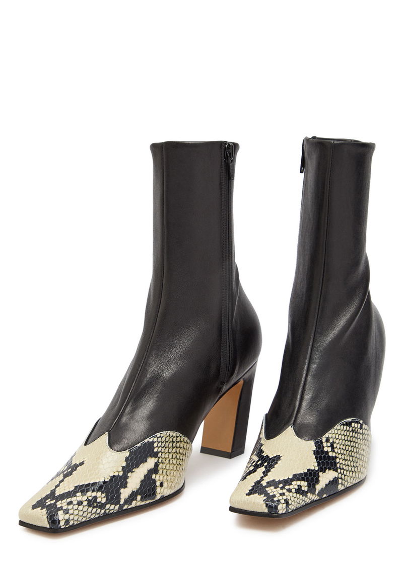 KHAITE leather boots. Heel measures approximately 3.5 inches/ 85mm. Python-effect western panel at pointed-square toe. Zip fastening at side.
