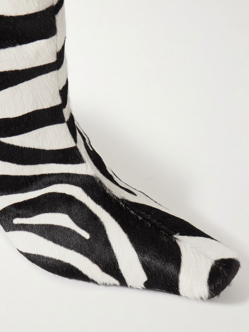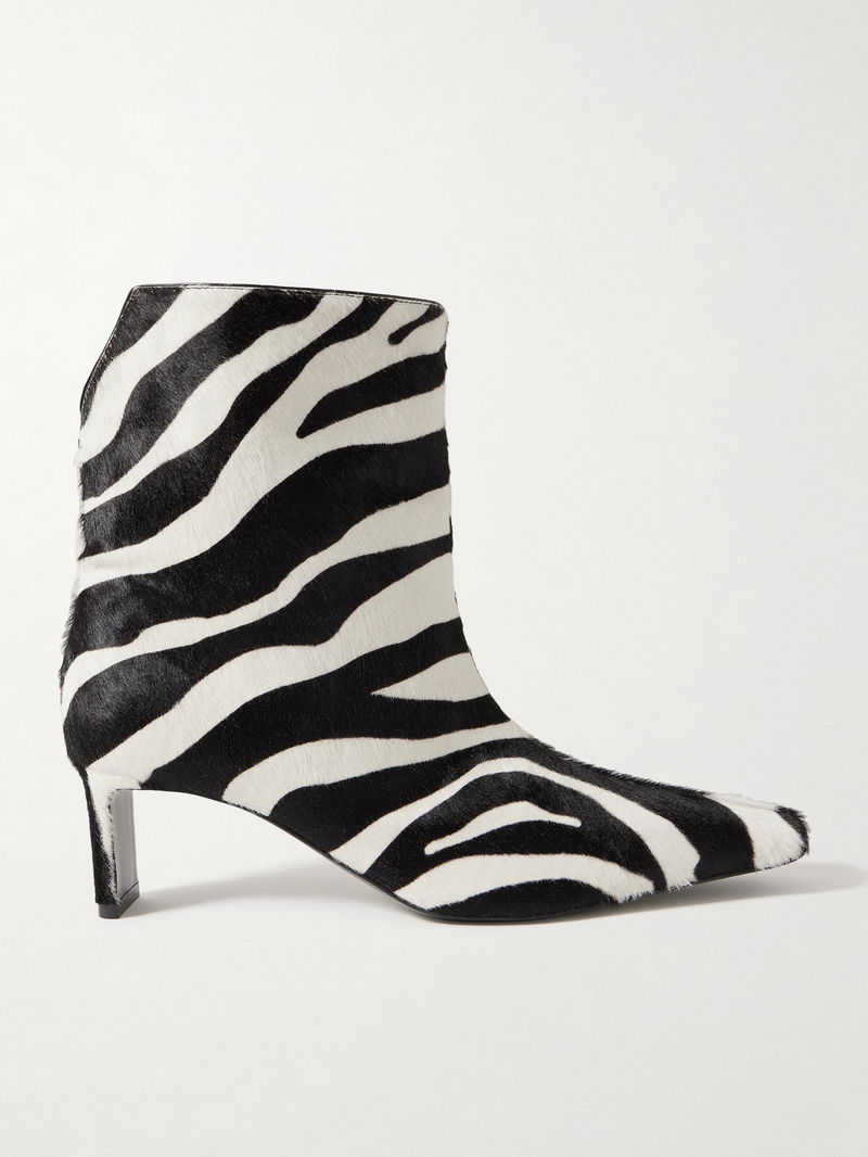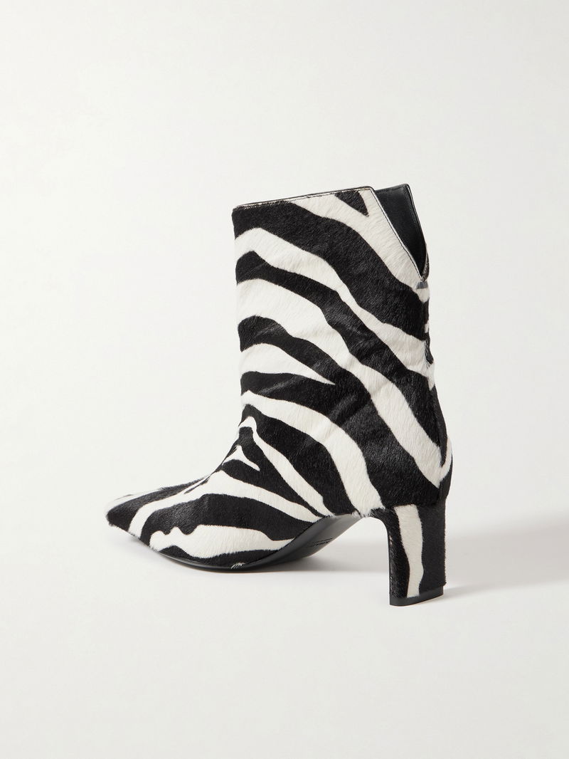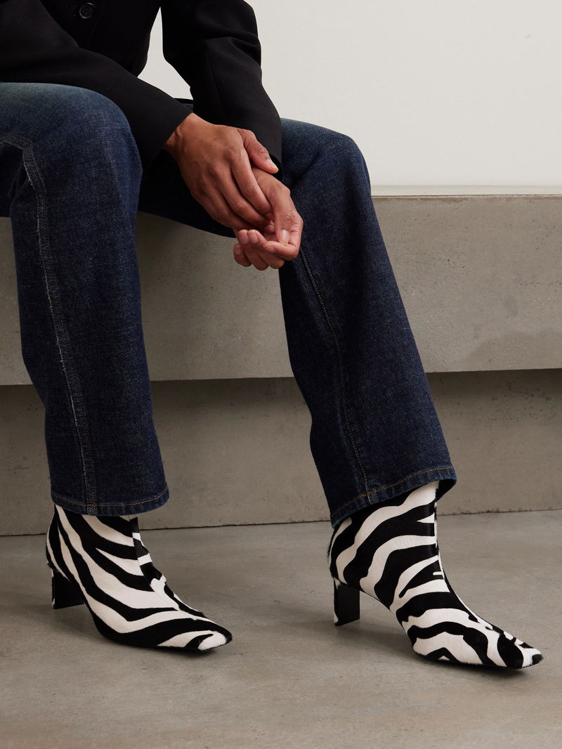 KHAITE's 'Ona' boots are distinguished by their narrow heels and the V-shaped cutouts at the back of the cuffs – a detail that also means they're more comfortable for walking. They're made from zebra-print calf hair and have elegant square toes.