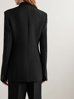Blazer, Satin, Cotton-blend, Shoulder pads, Buttoned cuffs, Two side welt pockets, Breast pocket, Button fastenings through double-breasted front, Fully lined.