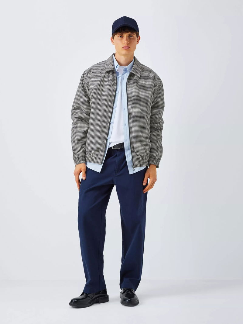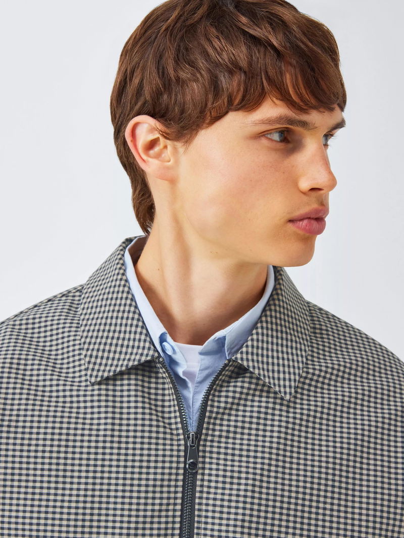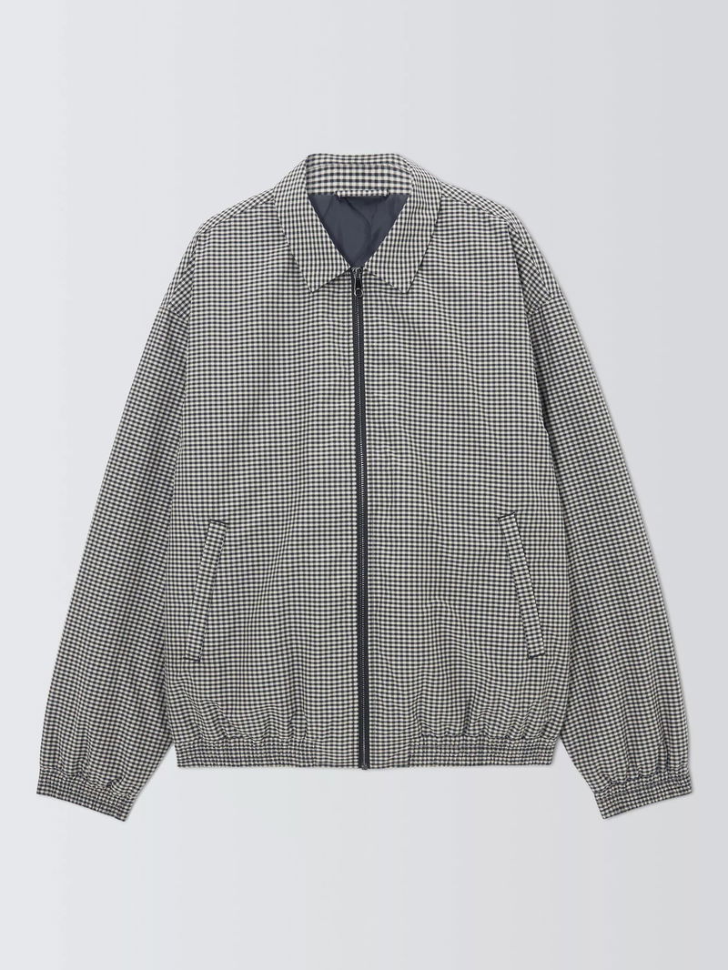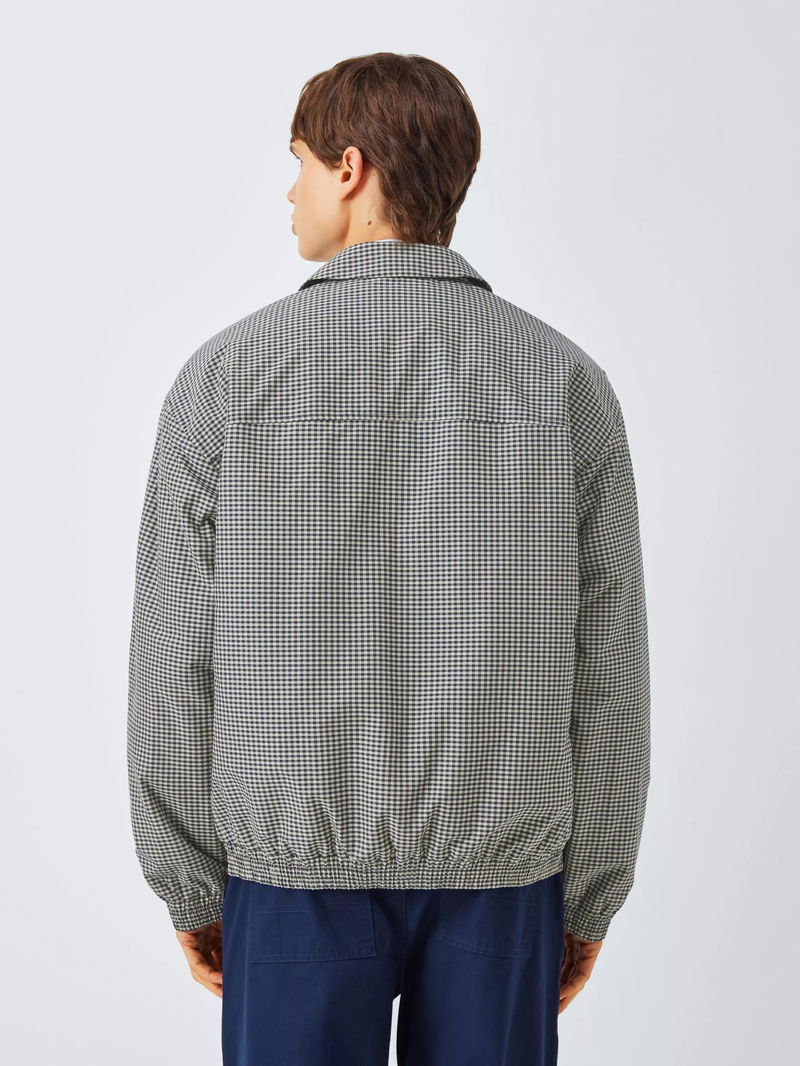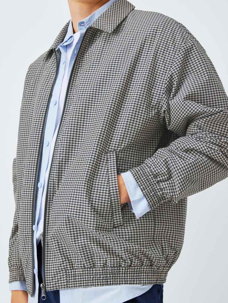 Check-patterned bomber jacket with a short elasticated waist and cuffs. Complete with a smart collar, comfortable lining and two slanted welt pockets to keep the design simple and Kin.