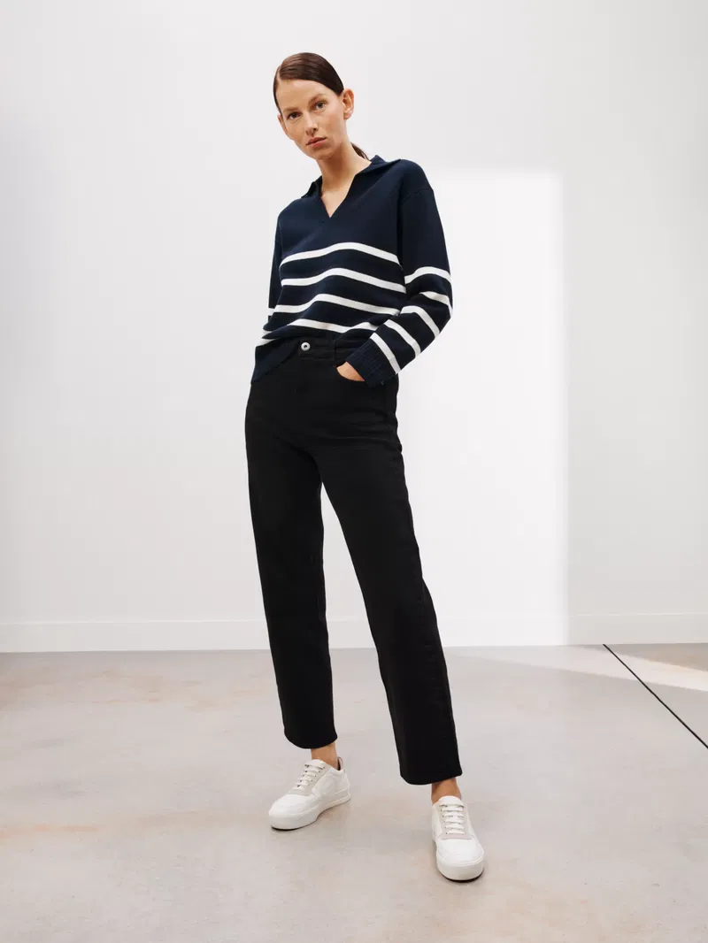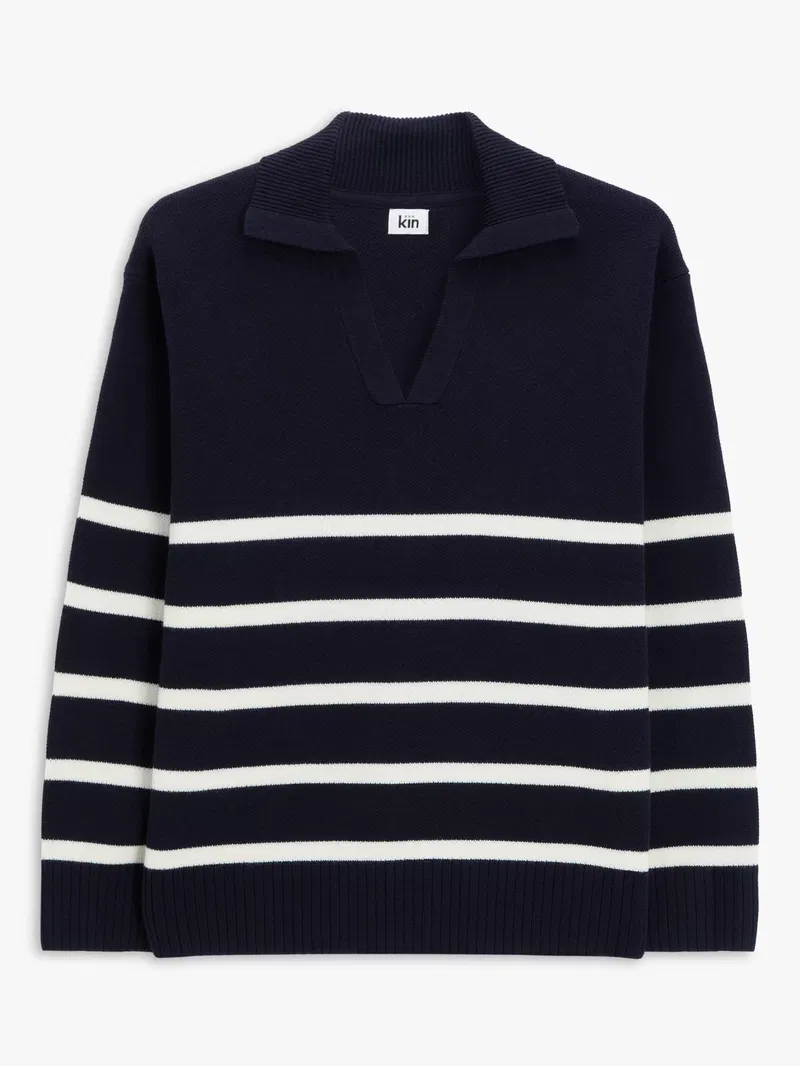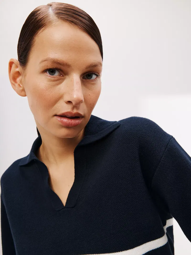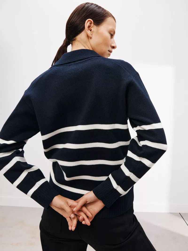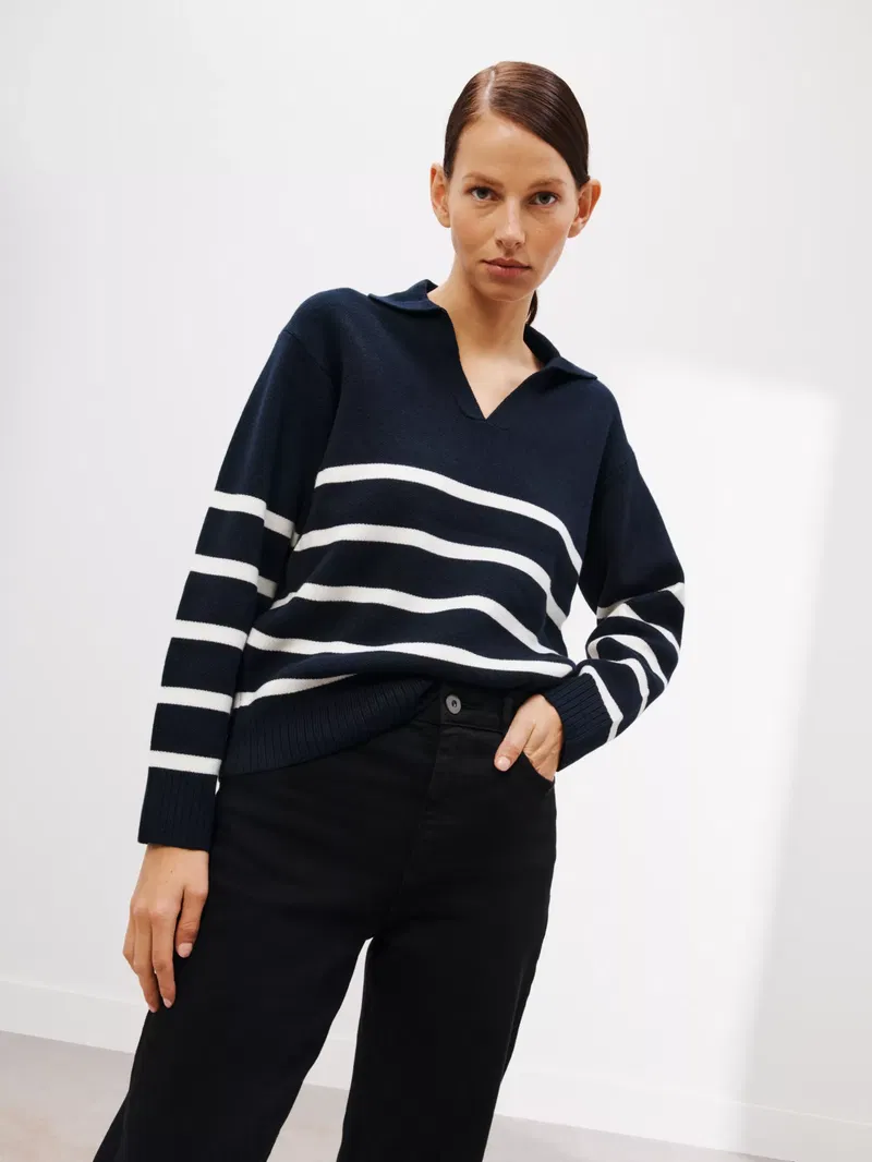 In a modern and sporty design thanks to the polo collar neckline, this cotton mix knit top comes in a classy and classic stripe print.