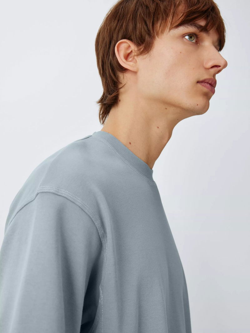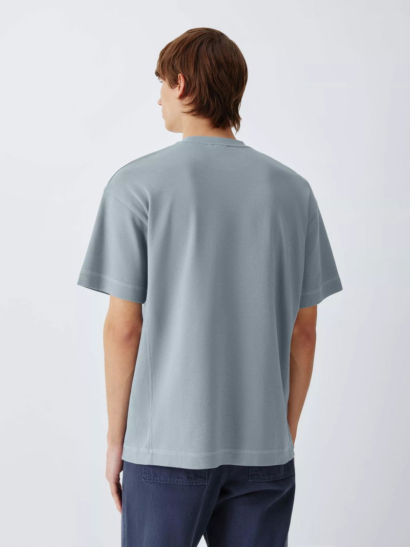 Triple-stitch detailing runs along the seams of this tee, adding a modern edge and reinforcing its high-stress areas. Crafted from heavyweight cotton, the fabric feels soft against the skin while maintaining a crisp, substantial drape. The relaxed, slightly oversized fit and dropped shoulders offer a contemporary silhouette that prioritises comfort without sacrificing style.