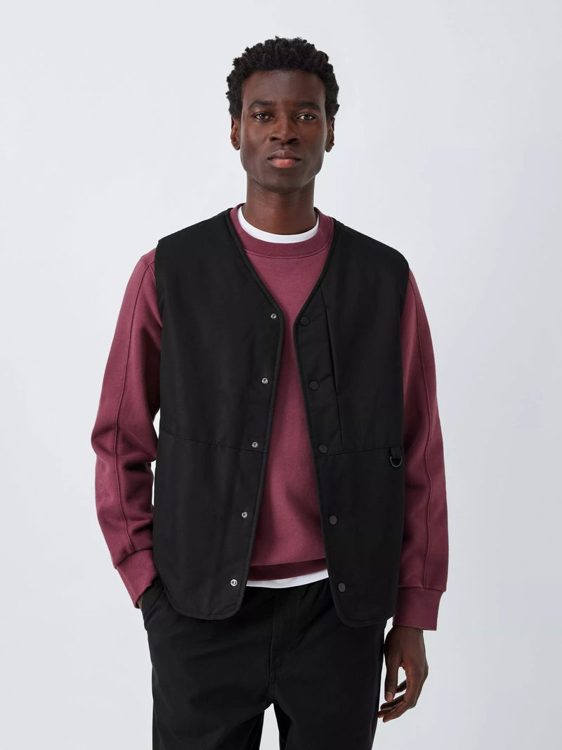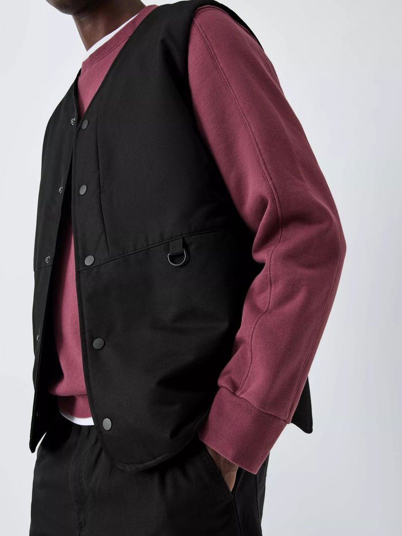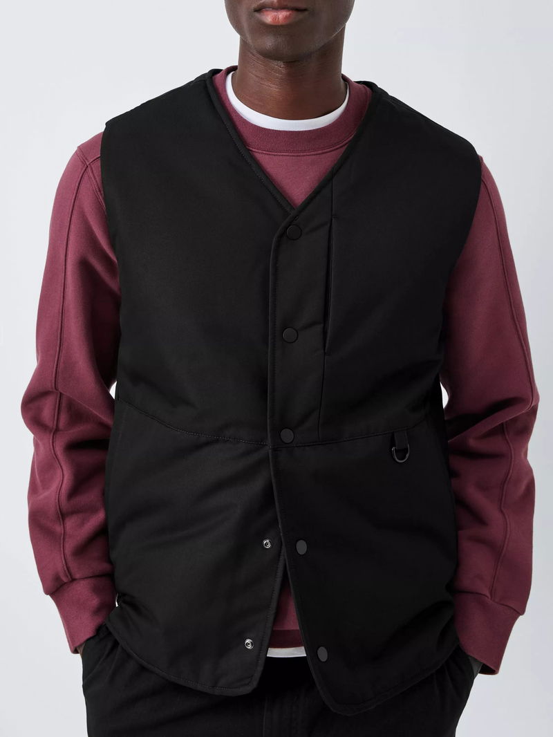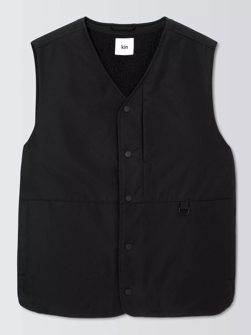 Gilet with press-stud fastenings down the centre front and a V-neck collar. Borg lining adds warmth, and the fabric has been washed for softness. Two side pockets with a D-ring detail complete the utility-inspired look.