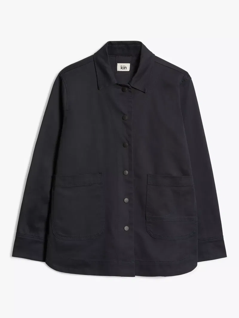 The perfect example of Kin's clean, contemporary style, this Kin workwear jacket is made from a soft BCI cotton blend in a relaxed silhouette. It has an easy shape with a utility-inspired design complete with two front patch pockets and a popper fastening.