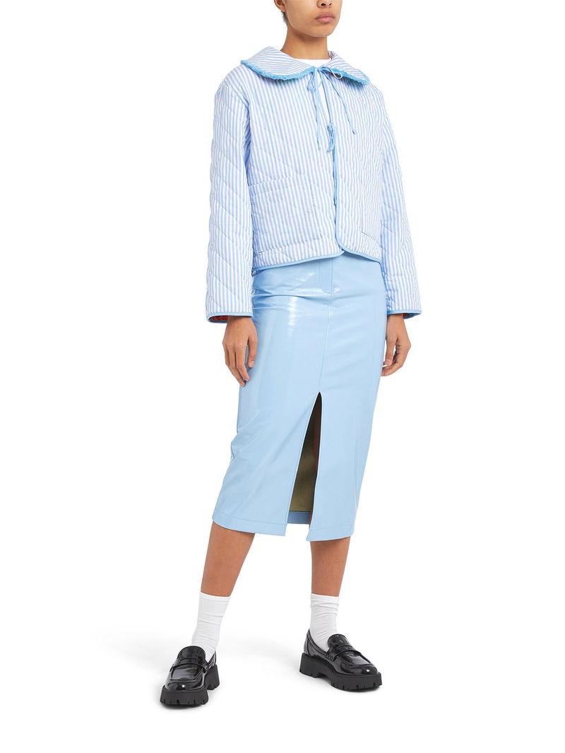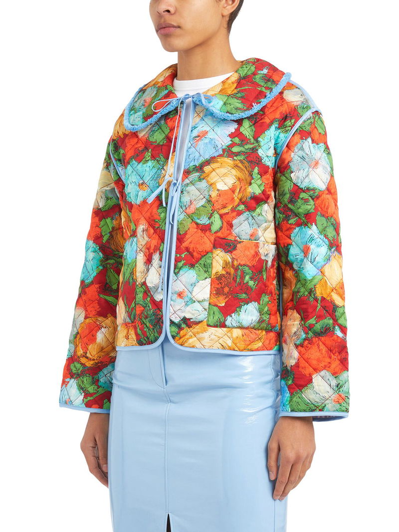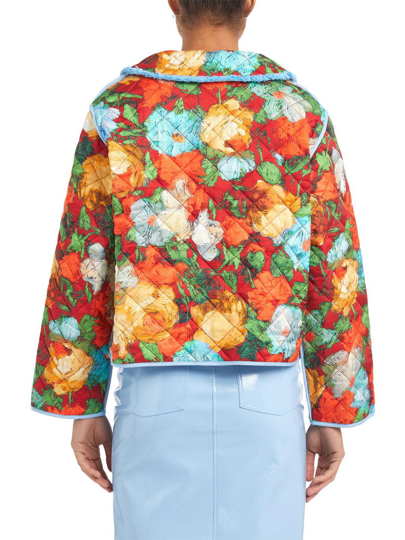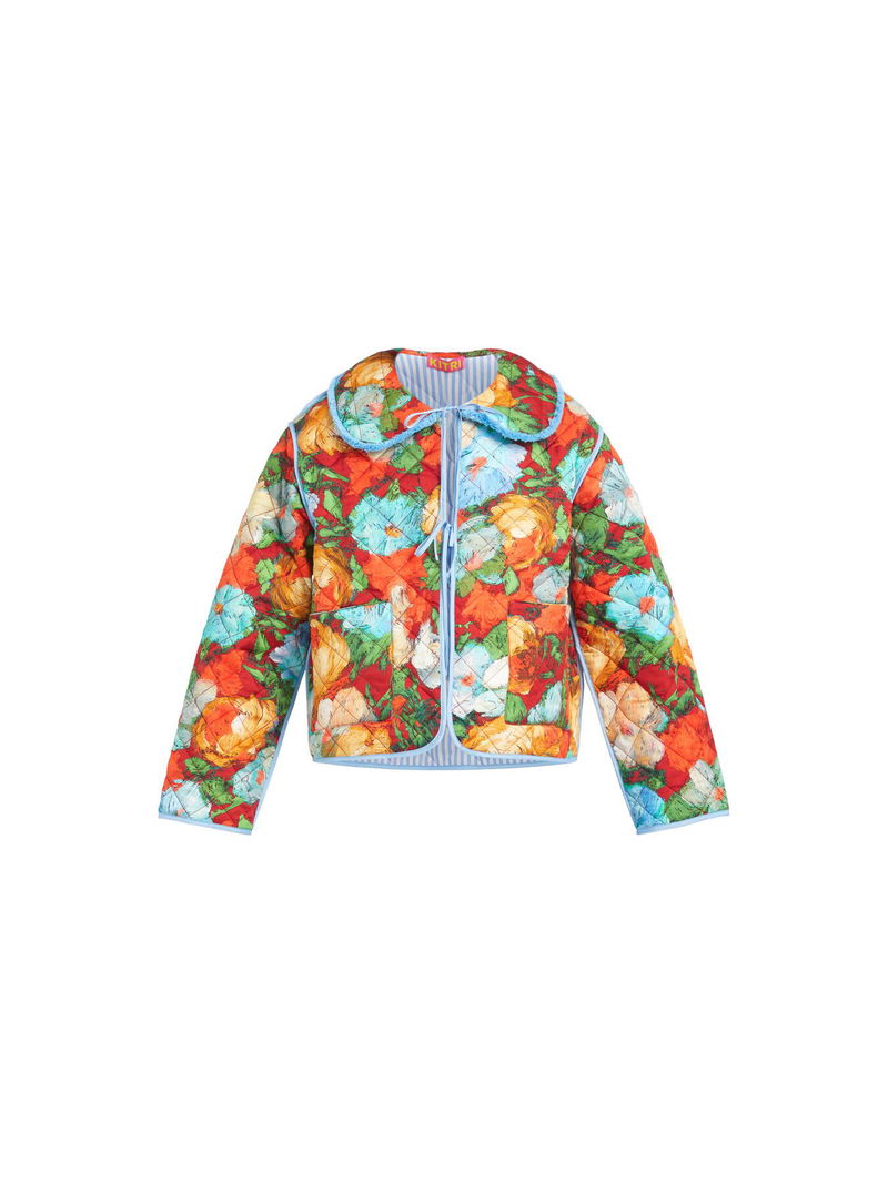 Piper is a reversible jacket, featuring Cezanne-inspired Blue Impressionist Floral print, a preppy blue stripe and patch pockets. It is quilted with contrast blue piping and tuft-trim collar detailing, has a collared neckline and long sleeves.