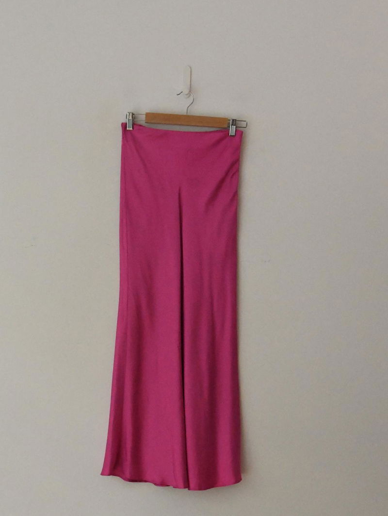 Hot pink, elasticated waist, satin midi skirt.