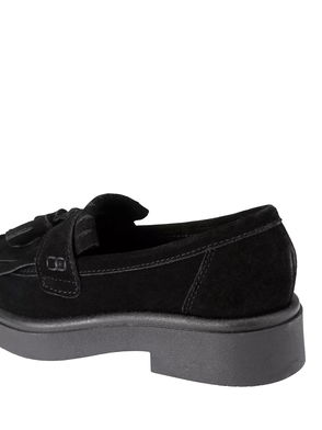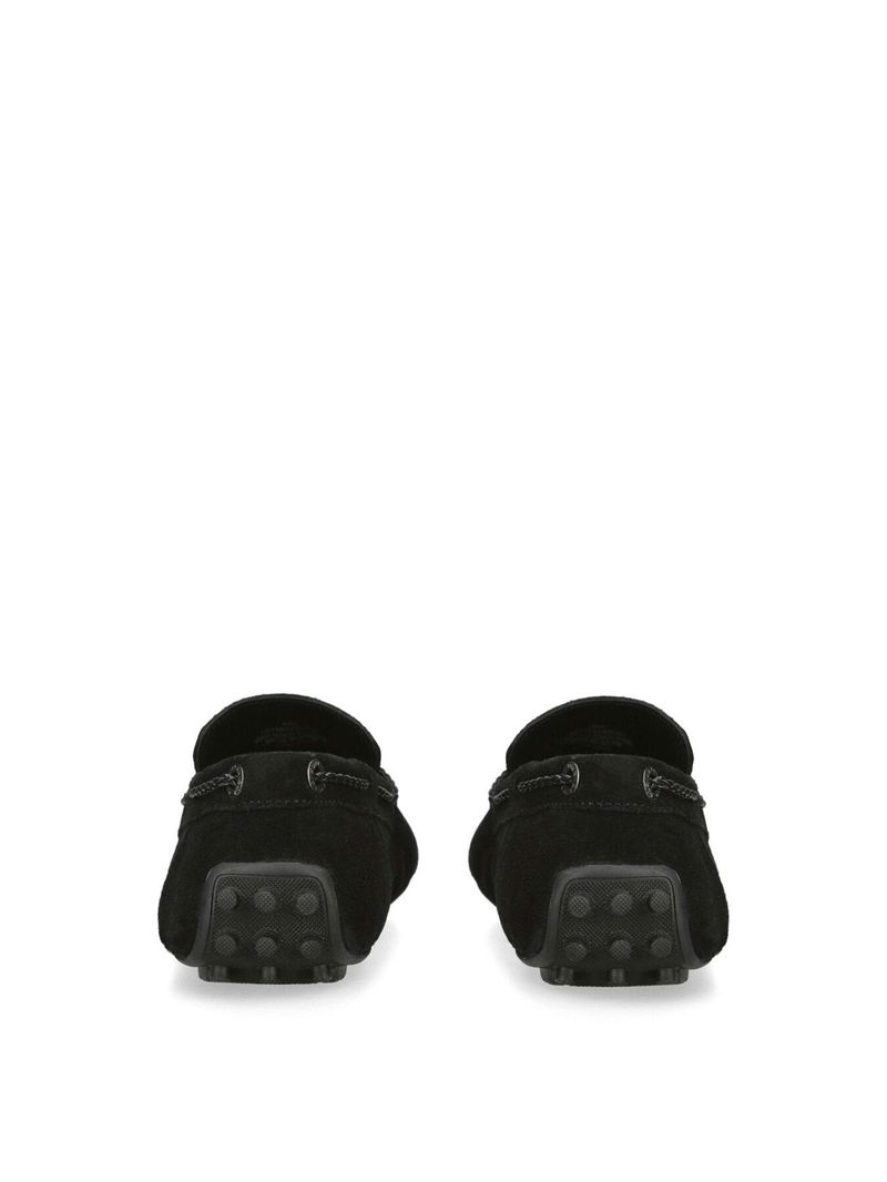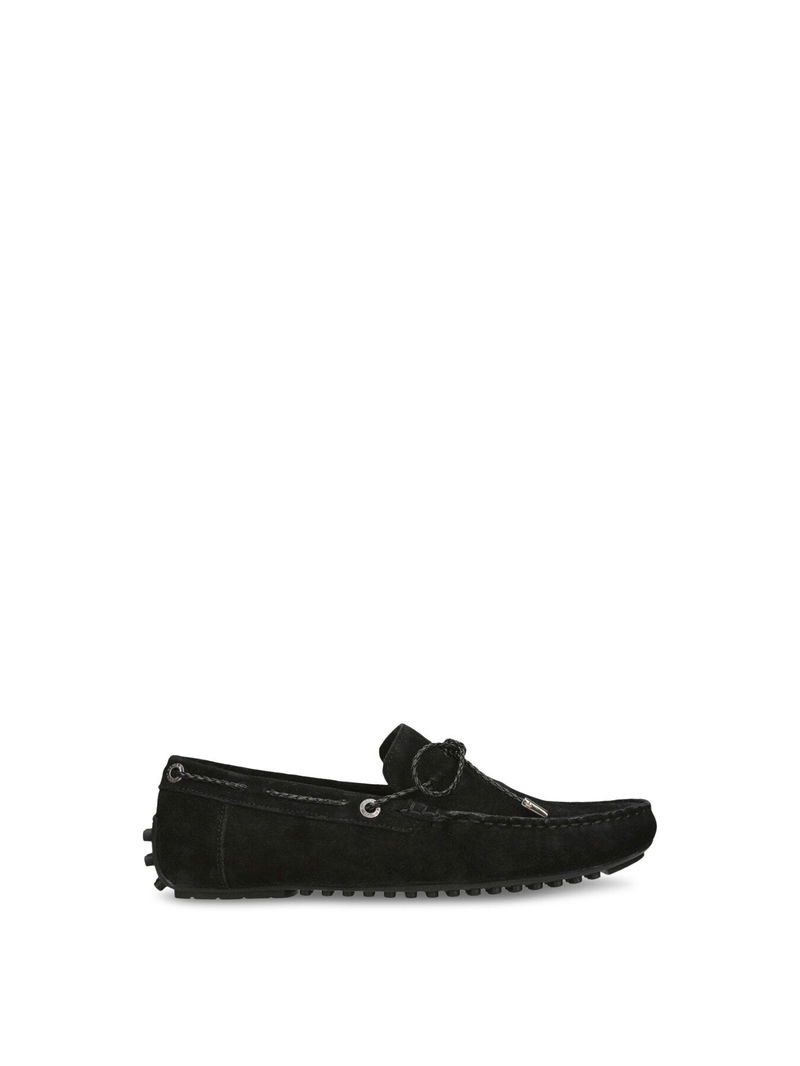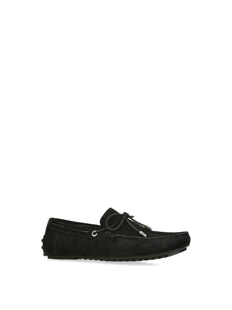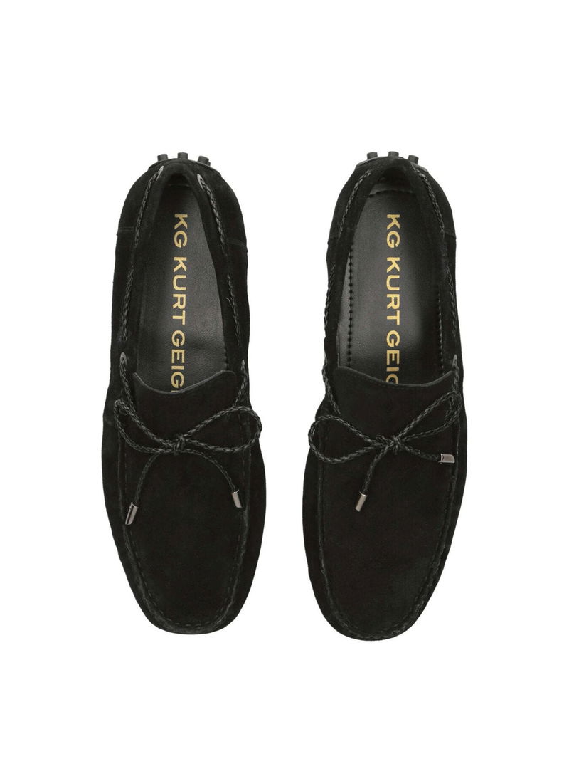 The KG Kurt Geiger Felix is a slip on loafer crafted in a black suede. There is a black braided strap pulling through the upper which creates a bow at the vamp.