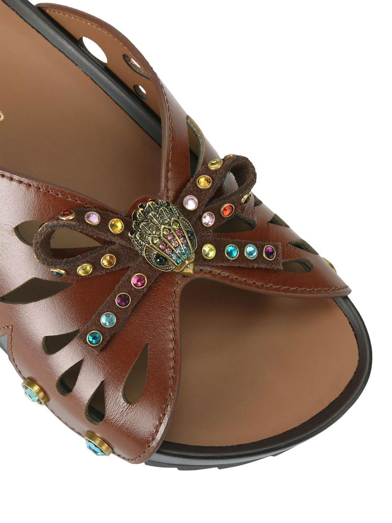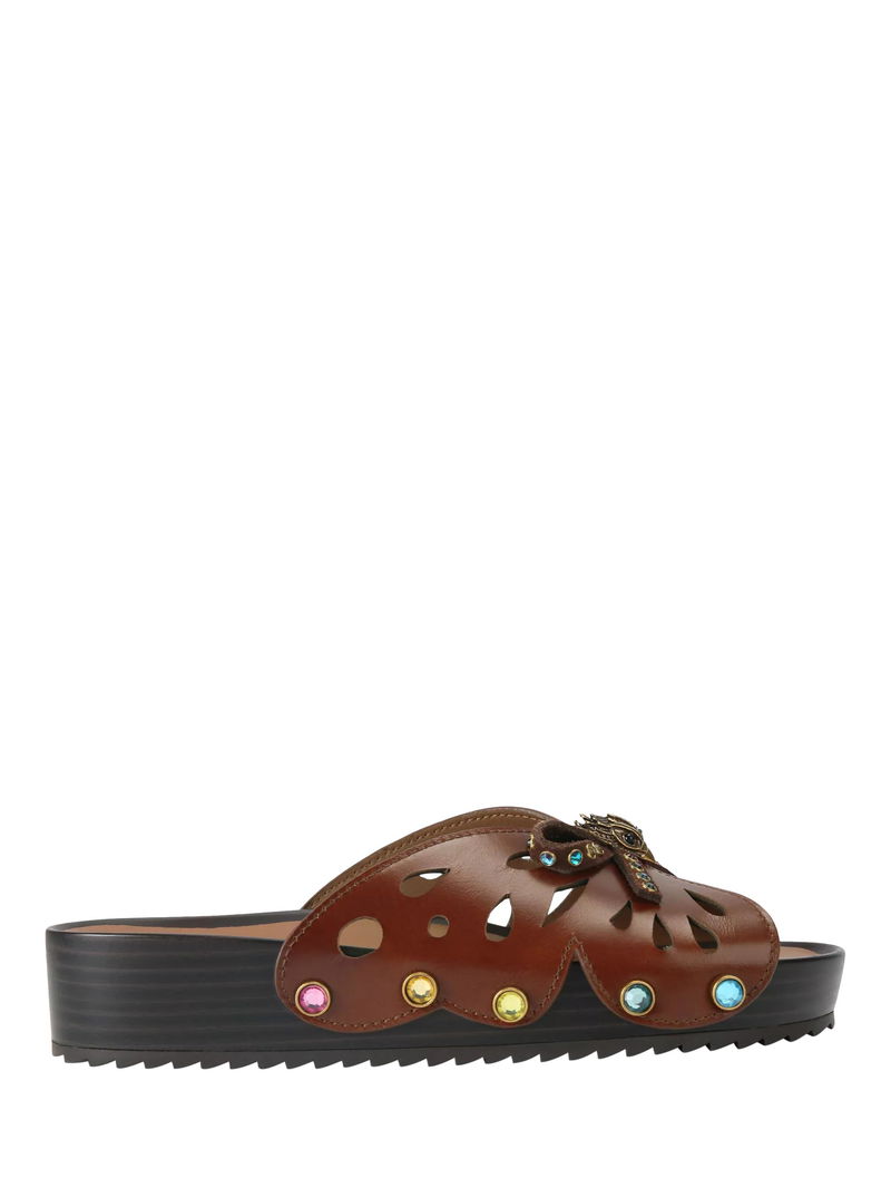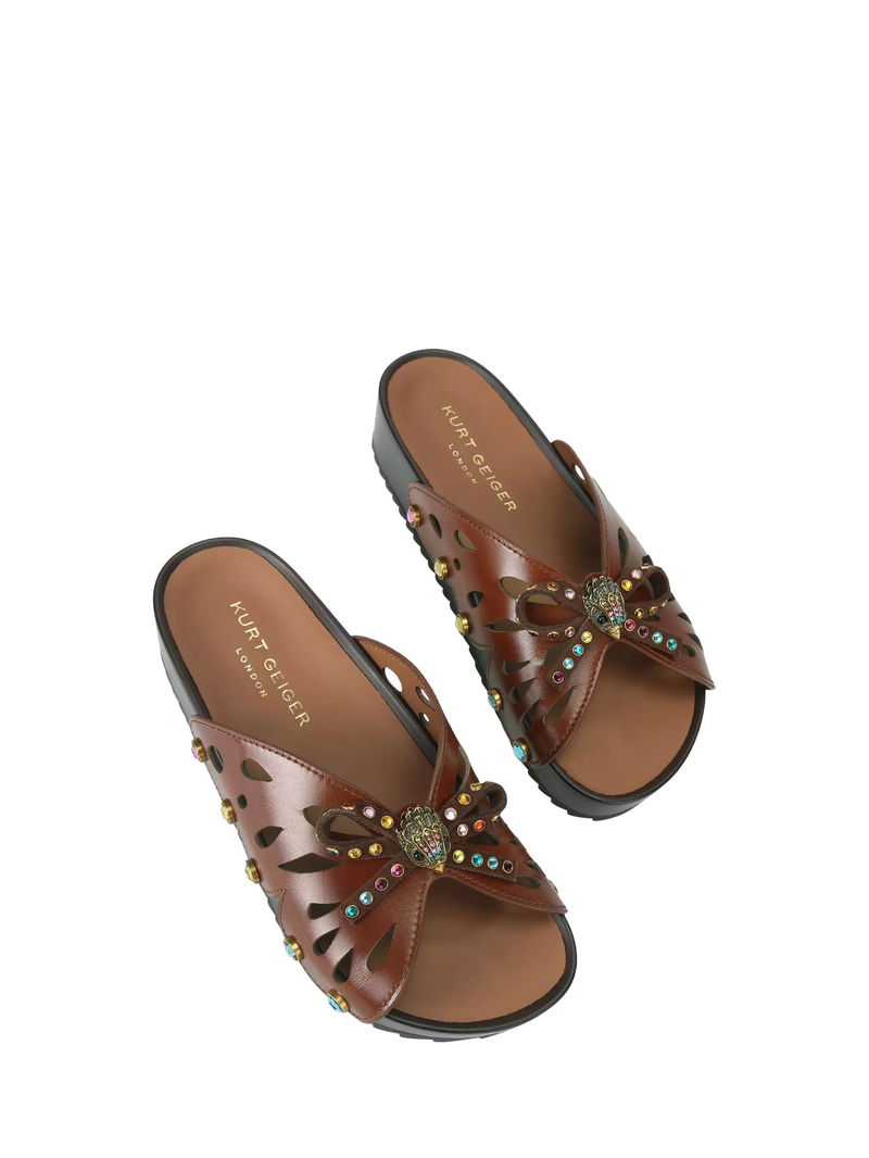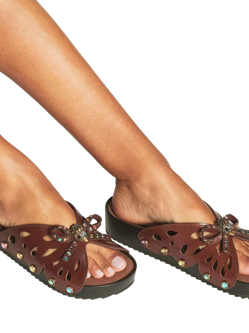 Boho Butterfly Embellished Leather Slider Sandals, Brown Mid